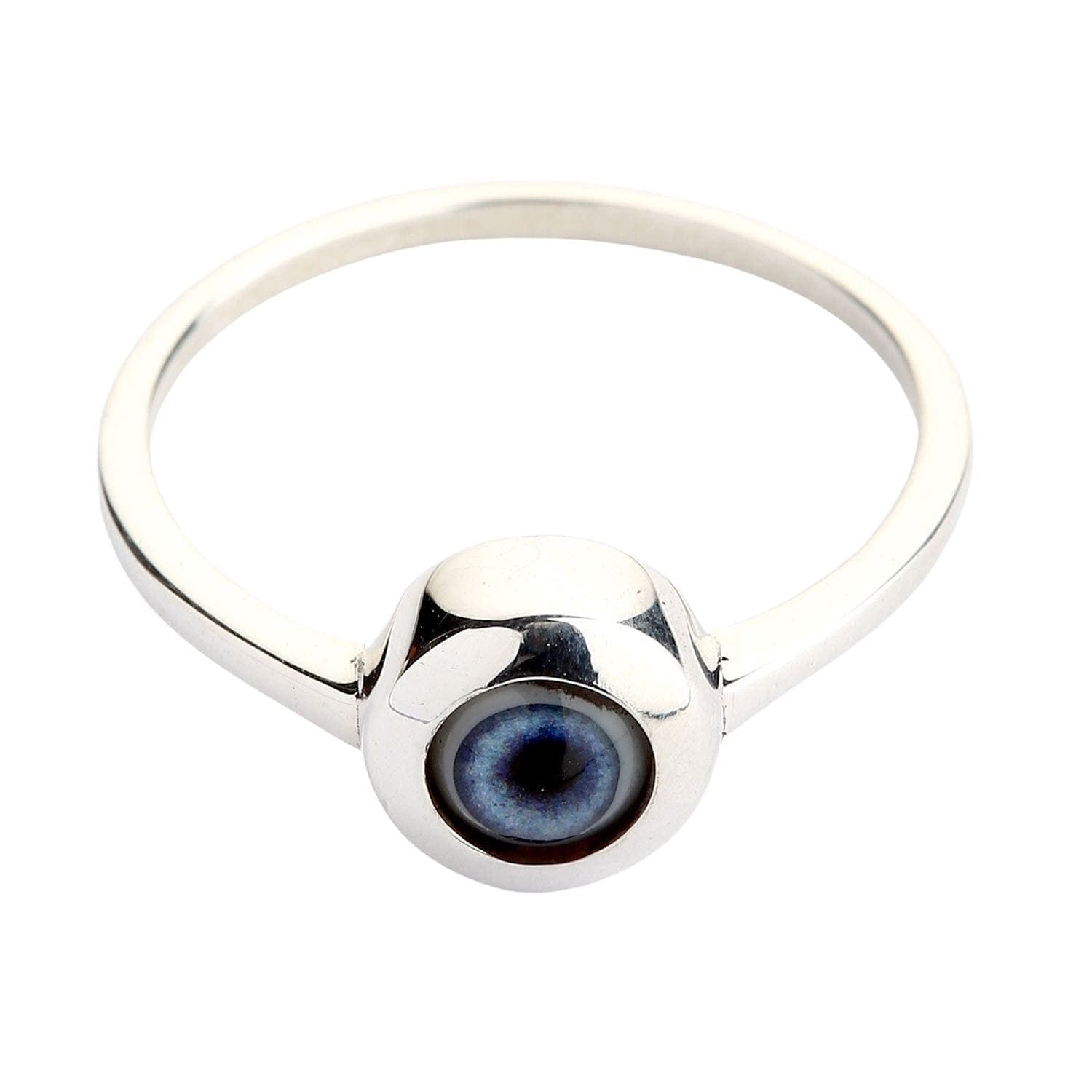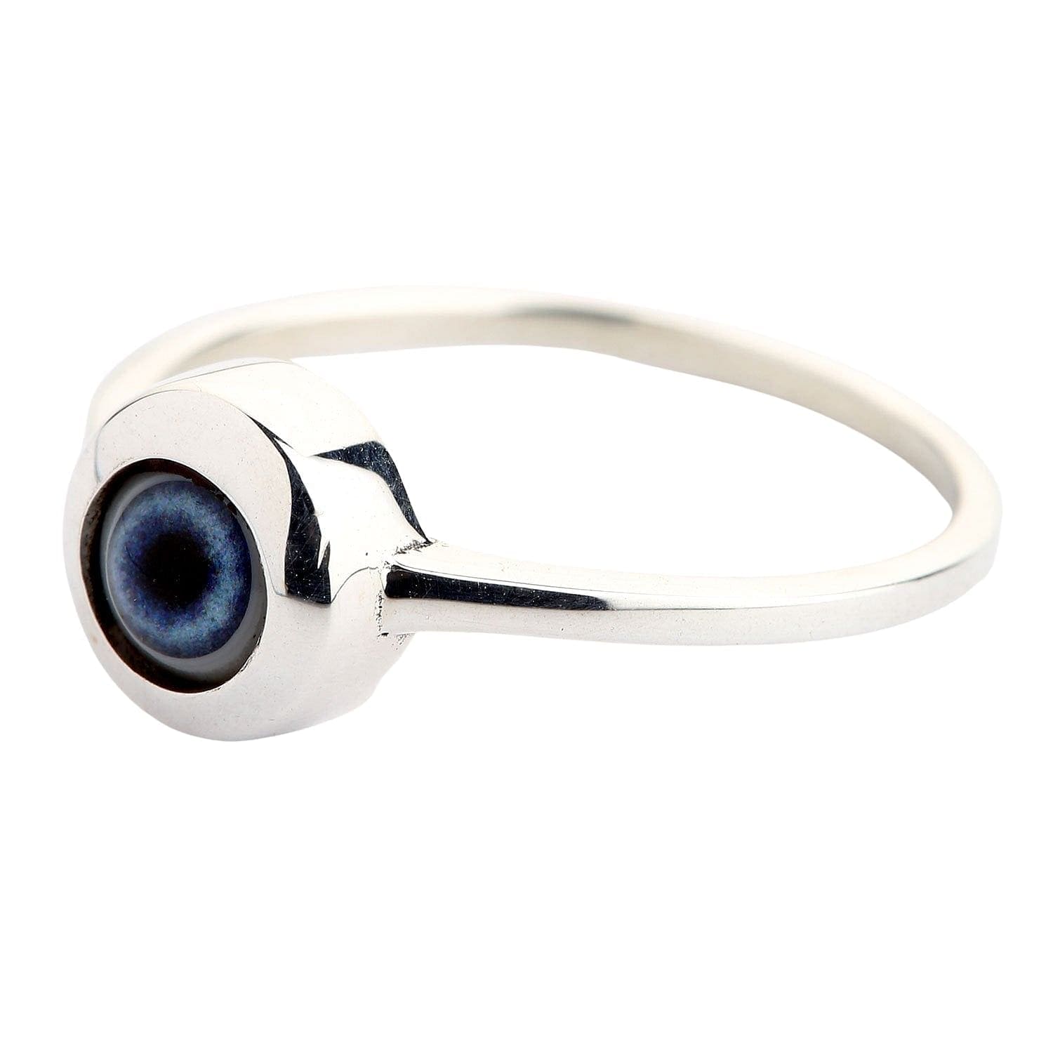 A minimalist evil eye ring in sterling silver, featuring a single blue eye on a delicate, polished band.
