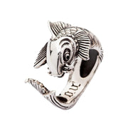 कोइ (Koi) मछली उंगली के चारों ओर नाक से पूंछ तक लिपटी हुई है, और इसका शरीर ही पूरी अंगूठी का आकार बनाता है। पीठ और किनारों पर तराशे गए तराजू (scales) व्यक्तिगत रूप से उभरे हुए हैं, जिनमें ऑक्सीकृत छाया (oxidized shadow) खूबसूरती से बसी हुई है। इसके पंख किनारों पर बाहर की ओर फैले हुए हैं — यह केवल सपाट डिजाइन नहीं है, बल्कि इतना उभरा हुआ है कि मेज के दूसरी तरफ से देखने पर भी यह अंगूठी एक थ्री-डी (three-dimensional) आकृति प्रदान करती है। 12 ग्राम ठोस .925 sterling silver से निर्मित यह अंगूठी US साइज 6 से 11 तक एडजस्ट की जा सकती है, और इसके खुले सिरे (open-ended) डिजाइन के कारण सिर और पूंछ ऊपर की ओर एक-दूसरे पर ओवरलैप होते हैं।