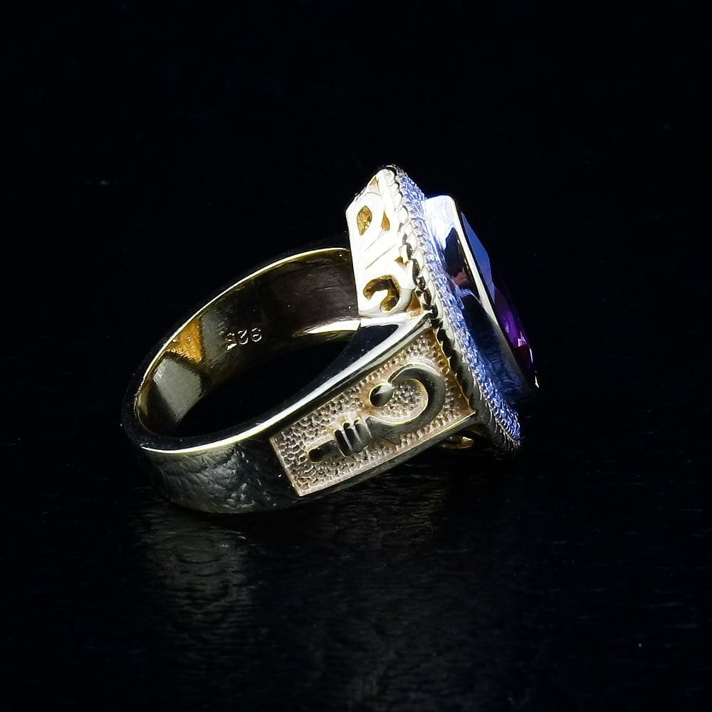 The centerpiece, a stunning navette-cut amethyst, glows with a royal purple hue—a color long associated with nobility and spirituality. As the February birthstone, this spiritual stone is believed to bring clarity and peace. Framed by a halo of brilliant cubic zirconia, this statement piece captures the light from every angle, creating a look that feels both vintage-inspired and powerfully contemporary. It's an heirloom-quality ring designed to be cherished. Explore our full collection of Bishop Rings for more unique designs.