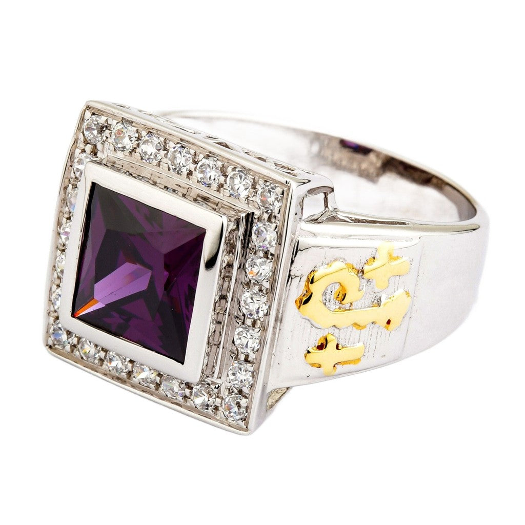 Side view of amethyst bishop ring showing 14k gold pastoral staff detail and CZ halo