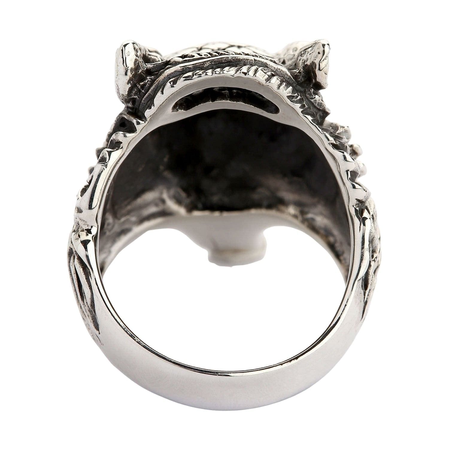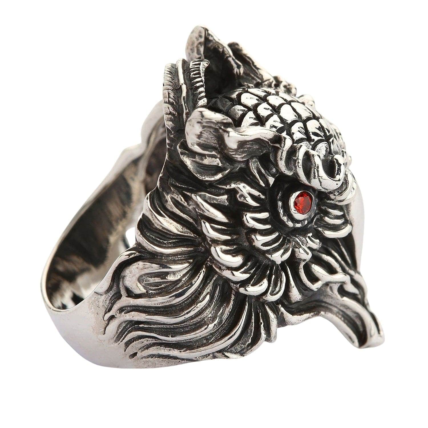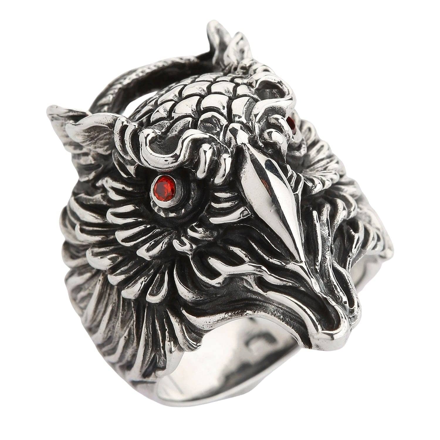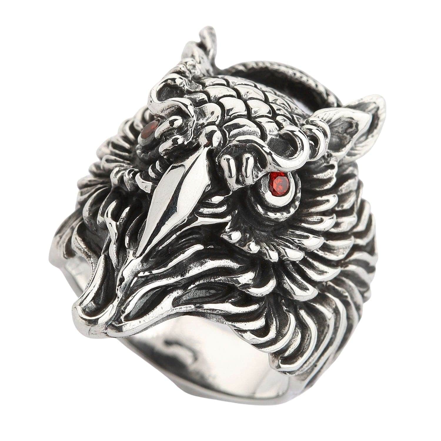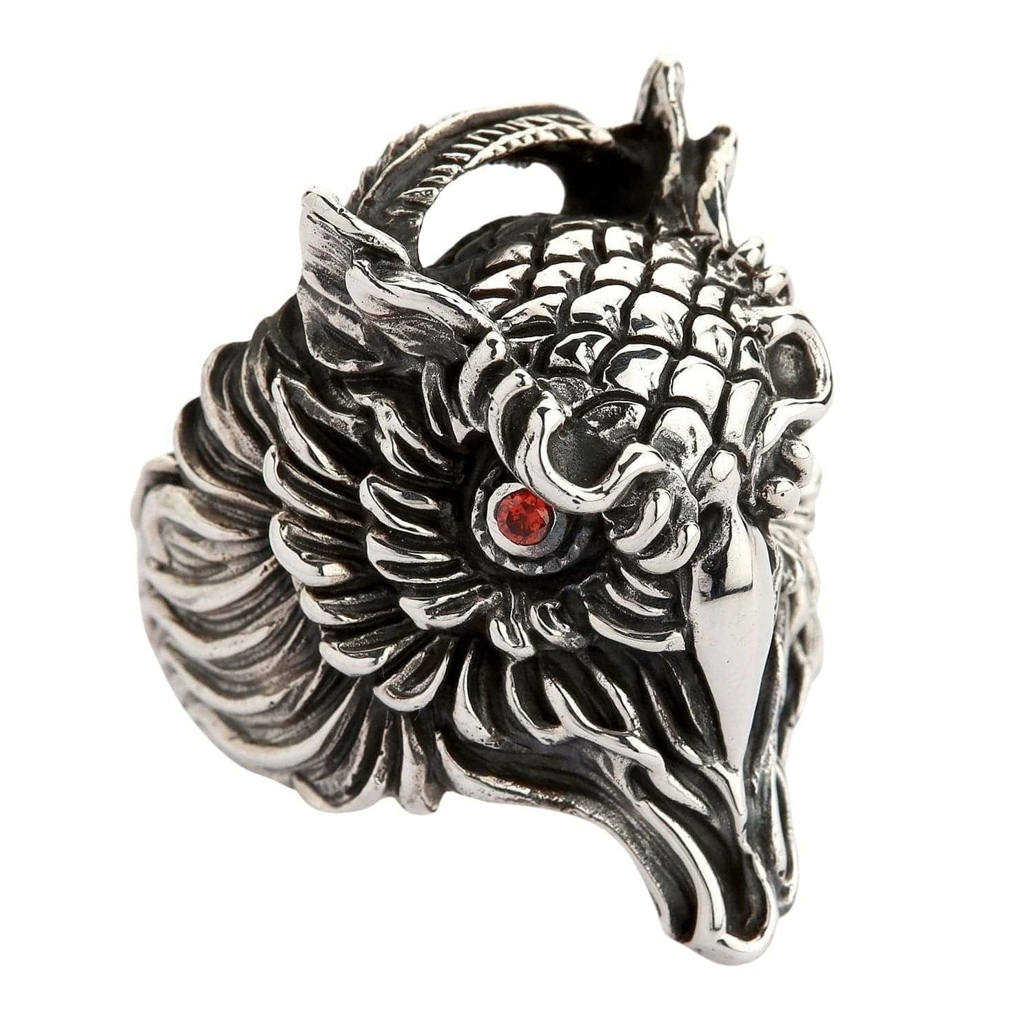 This ring is a masterclass in texture and intensity. The entire face is an exquisitely sculpted owl's head, its fierce and watchful expression captured with incredible detail. The surface is a tapestry of intricately carved feathers, each one defined by a dark, oxidized finish that creates a stunning, realistic sense of depth. Burning brightly from within the deep sockets are two brilliant, deep red Cubic Zirconia stones. These fiery eyes transform the wise owl into a symbol of passionate wisdom and supernatural power—an intelligence that is alive and formidable. The wide, substantial band wraps comfortably around the finger, making this 22-gram piece of wearable art as powerful as the creature it depicts.