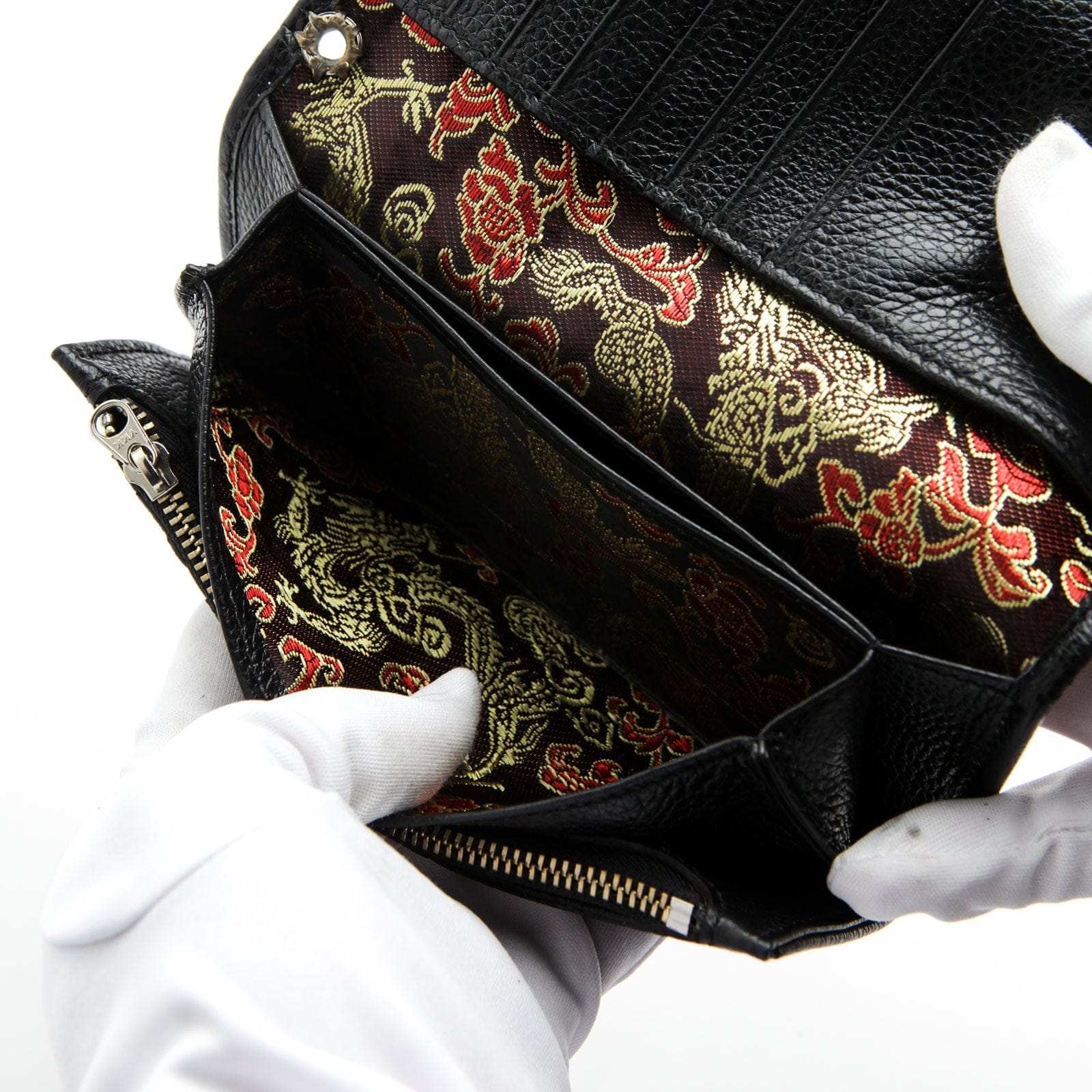 The artistry continues inside. Open this long wallet to reveal a luxurious surprise: a silky interior lining printed with a golden Emperor Dragon pattern. Designed for the serious road warrior, the interior boasts an incredible fourteen card slots, multiple bill compartments, and a zippered pocket for valuables. A solid silver grommet ensures you can securely attach your favorite wallet chain. Explore our full range of premium gear in our Biker Wallets collection.