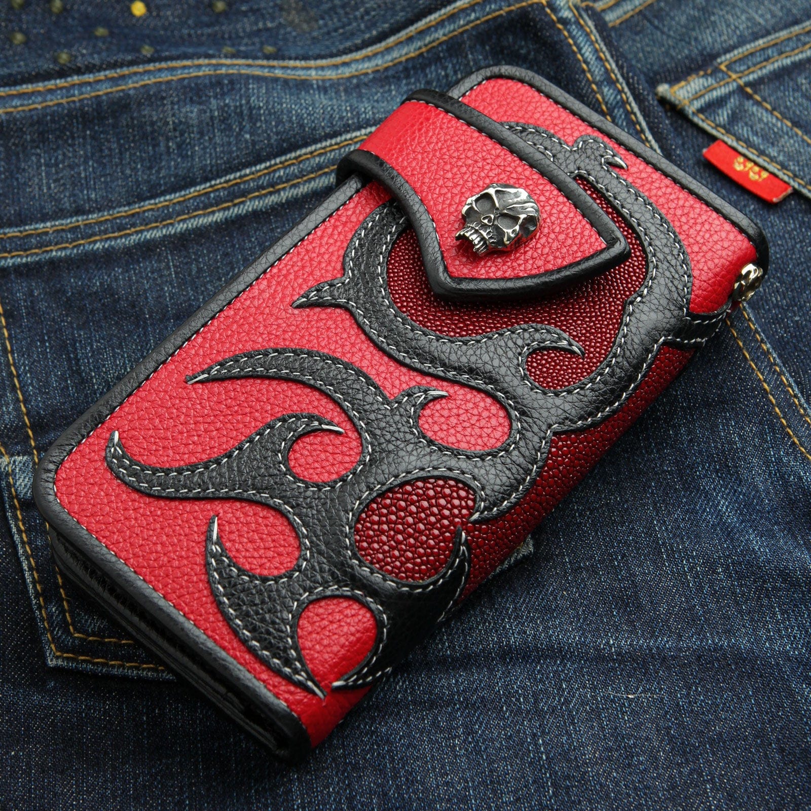 This wallet is a masterclass in texture and color. The fiery red panels are made from genuine stingray leather—also known as shagreen—prized for its unique, pearly texture and incredible durability. Laid over this is a black cowhide leather inlay, expertly cut into a bold tribal flame design. The wallet is secured with a heavy-duty snap closure, adorned with a menacing sterling silver skull concho.