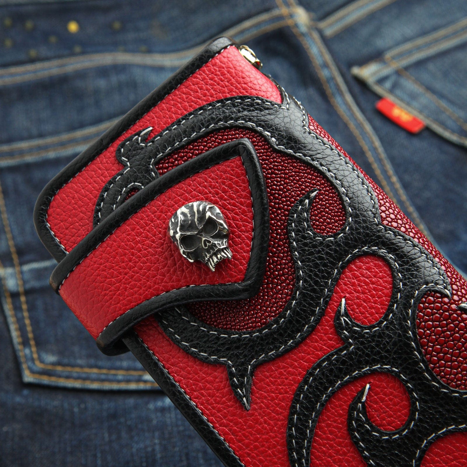 Ignite your style with this incredible Red Stingray Biker Wallet. This is not your average wallet; it's a bold statement of craftsmanship and a testament to true custom style. Meticulously handcrafted from a dynamic combination of genuine stingray and cowhide leathers, it's the ultimate accessory for the rider who demands the best.
