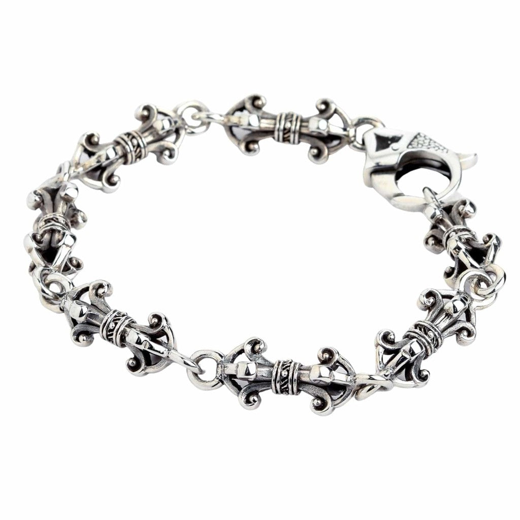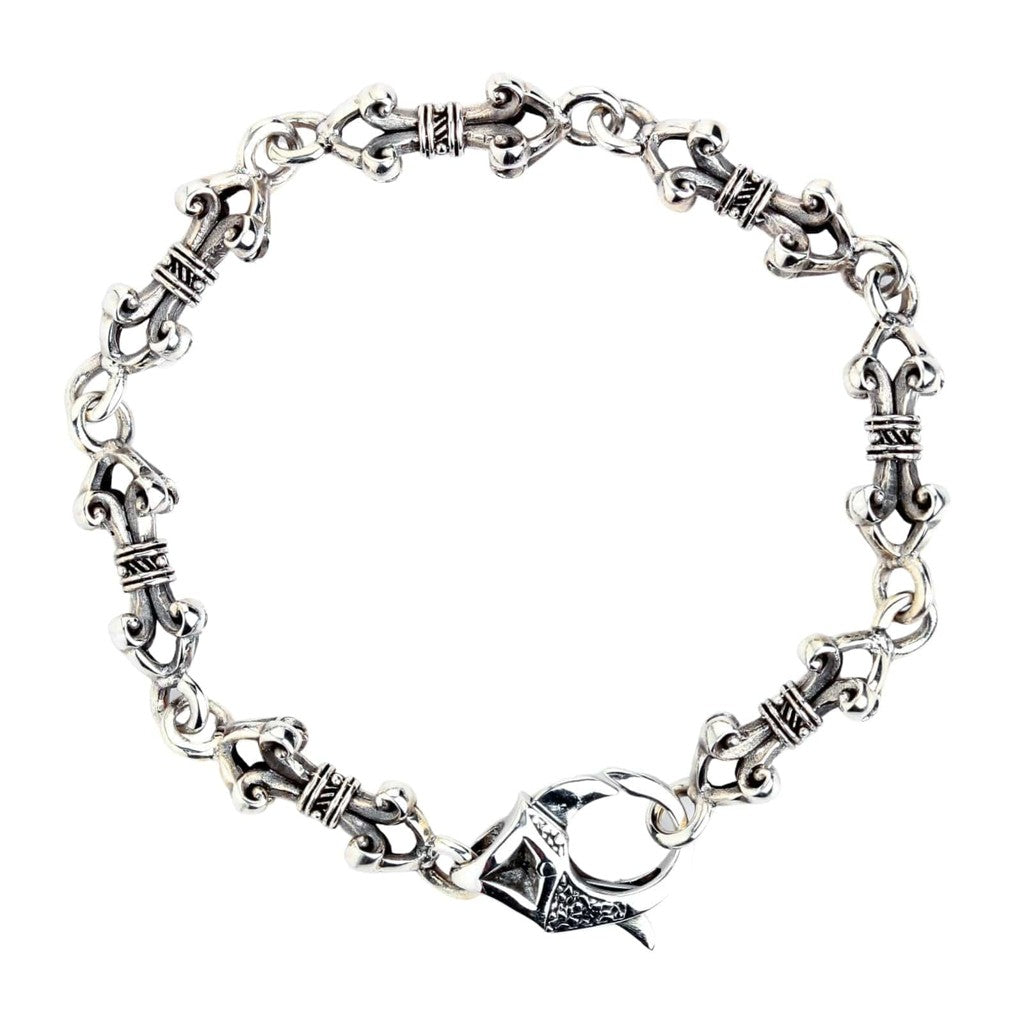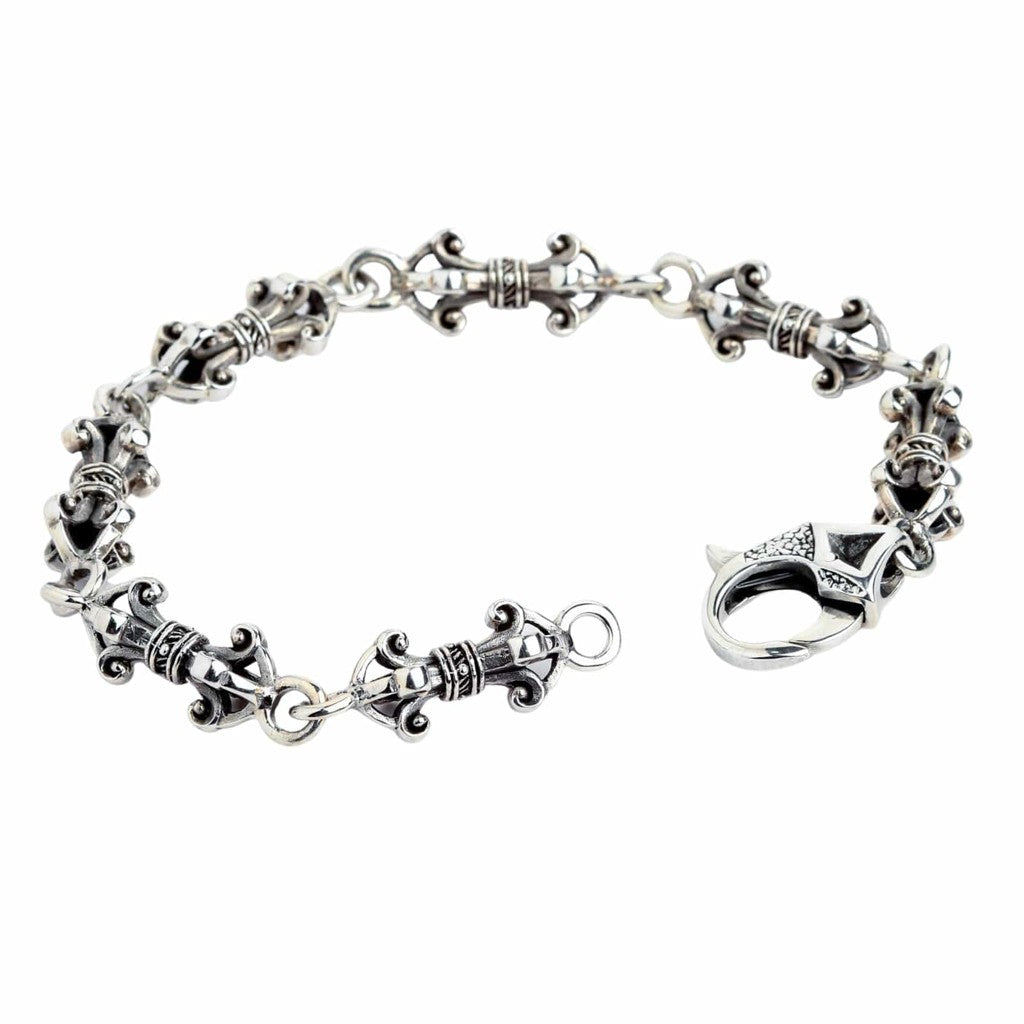 Full view of sterling silver dorje bracelet showing intricate link pattern