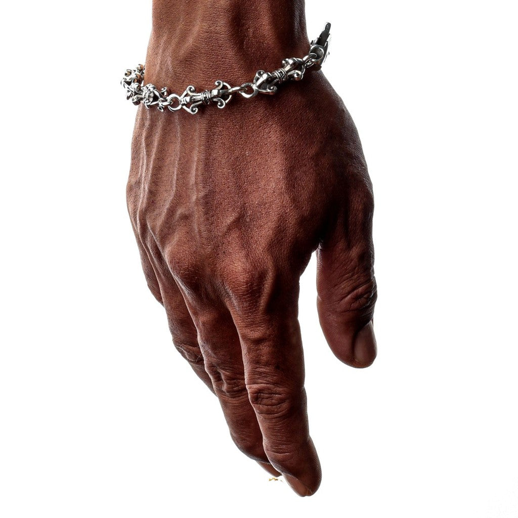 Mens silver dorje bracelet worn on wrist showing fit and drape