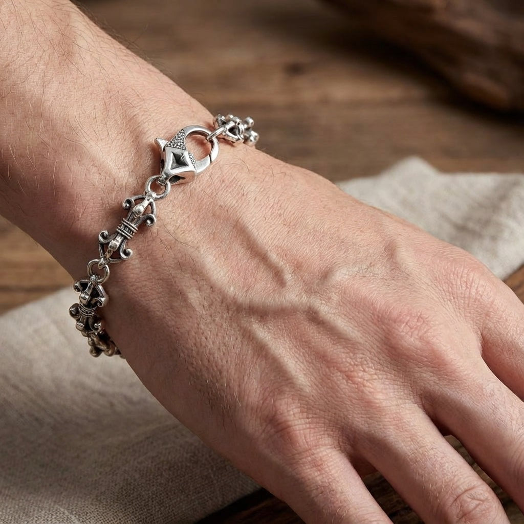 Detailed view of decorative lobster clasp on a mens silver bracelet