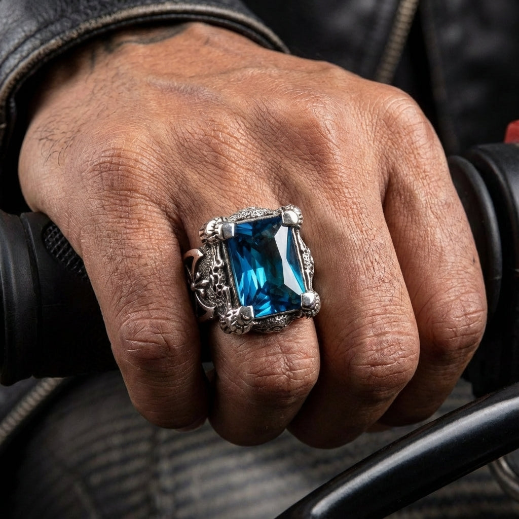 नीला टोपाज़ ड्रैगन क्लॉ स्टर्लिंग सिल्वर पुरुषों की अंगूठी