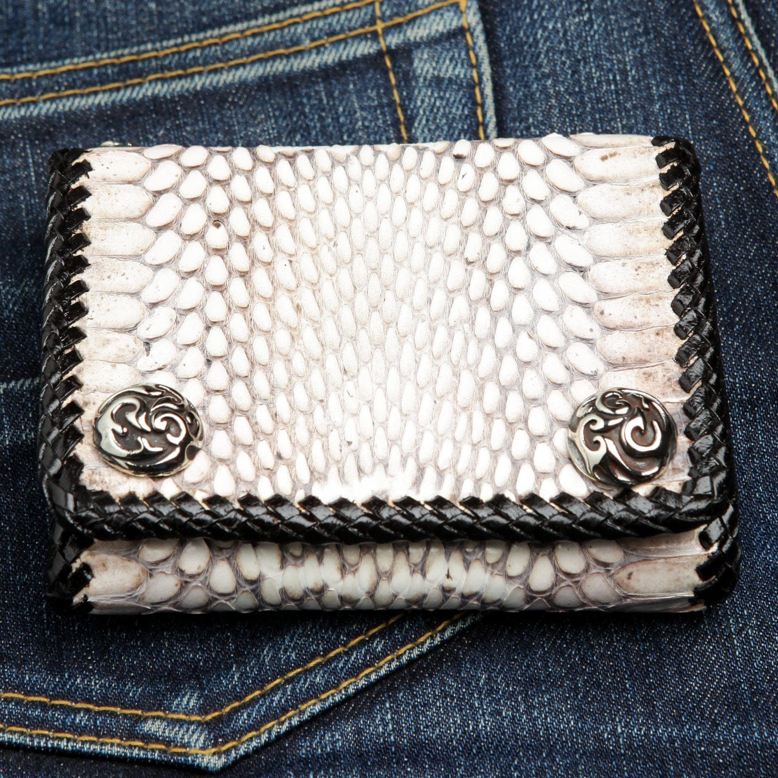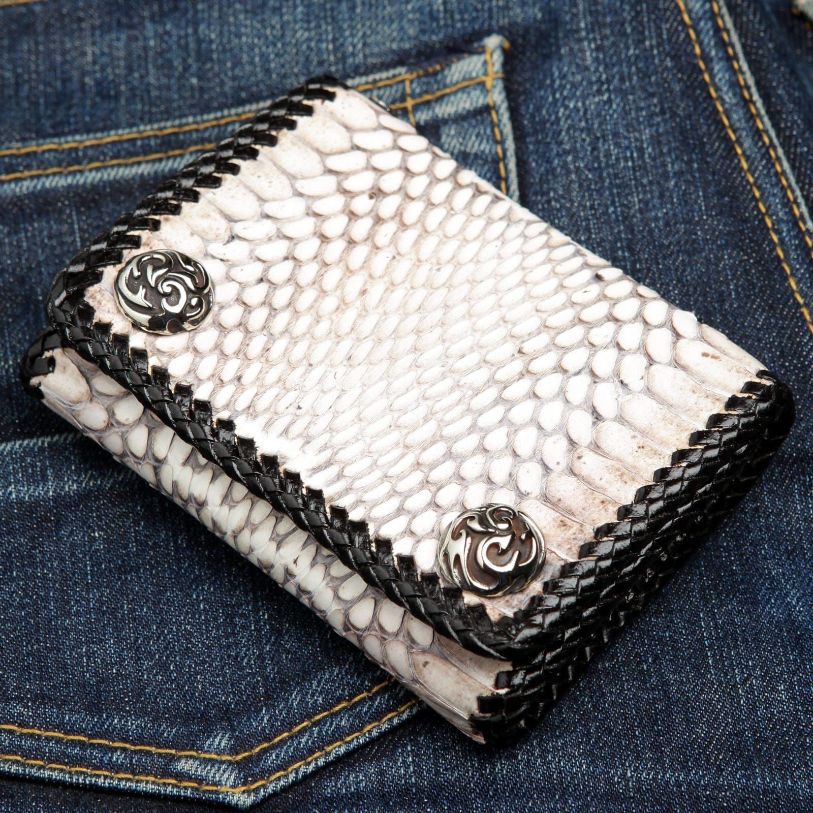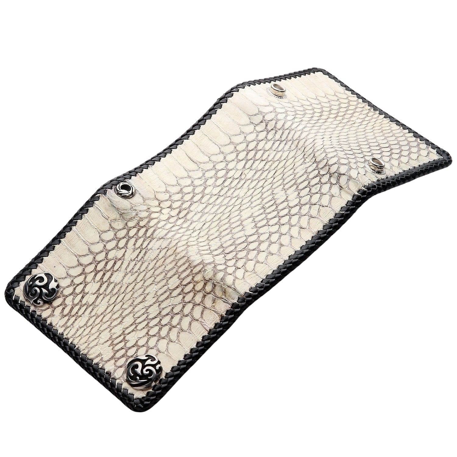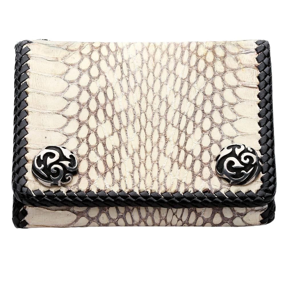 This trifold biker wallet is built for the road. The entire piece is framed by a durable, hand-laced black leather braid, creating a stunning, rugged contrast against the white cobra scales. Two large, ornate silver-tone snaps with gothic swirls secure your essentials with authority. Inside, you'll find a highly functional trifold interior lined with premium black cowhide leather. It's packed with storage but maintains a sleek profile. Plus, the built-in grommet makes it ready for your favorite wallet chain.