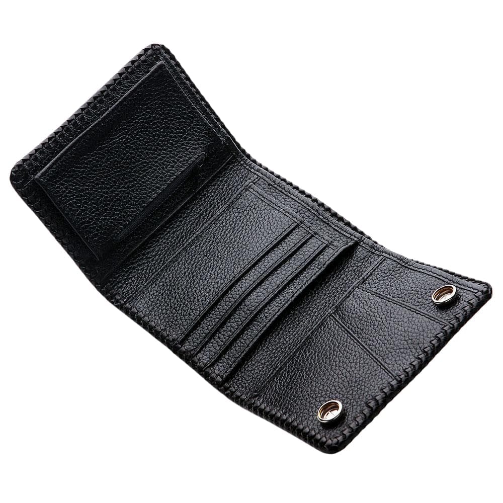 - Design: Trifold Biker Wallet with heavy-duty black braided trim.