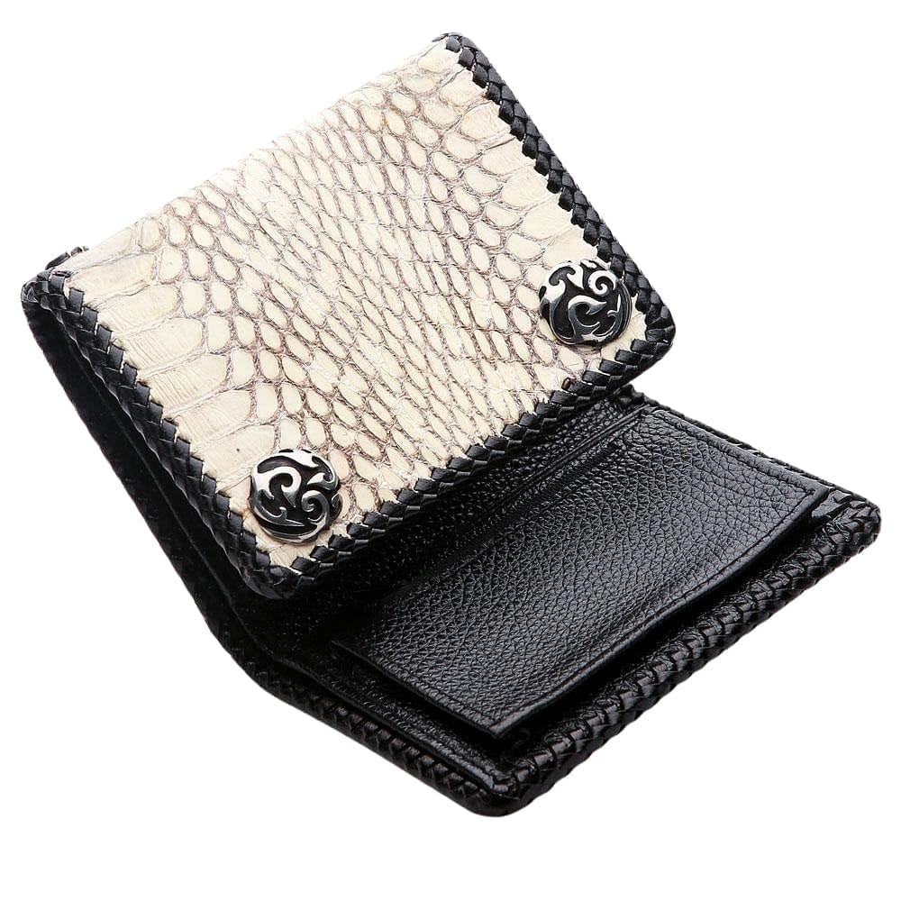 Unleash your untamed side with our genuine Cobra Snake Biker Wallet. This isn't just a wallet; it's a handcrafted statement of rebellion and style. Made from authentic white cobra skin, this wallet showcases the unique, intricate scale pattern that makes each piece one-of-a-kind. It's the ultimate exotic leather wallet for the serious biker.
