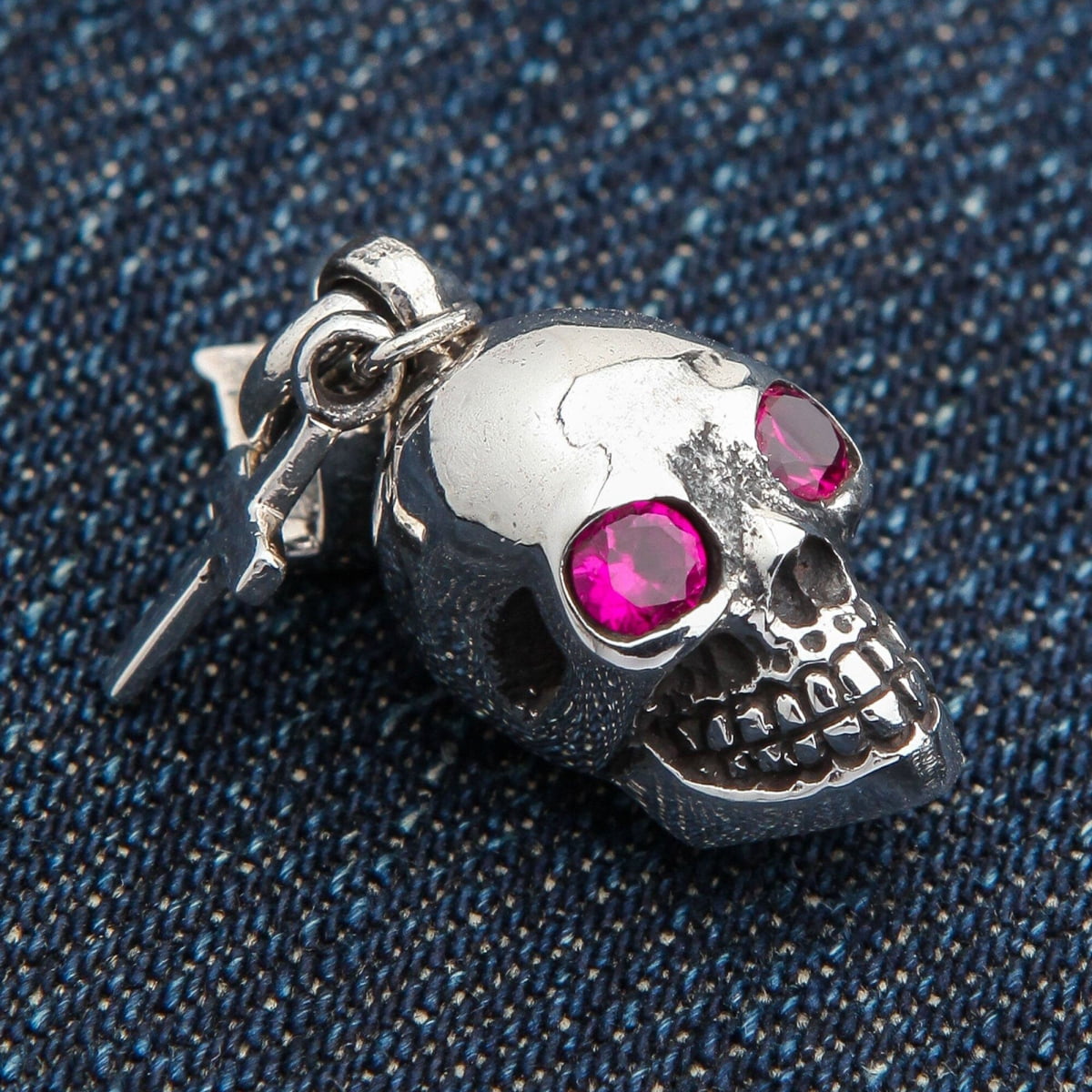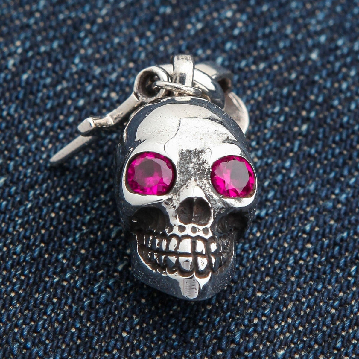 🔥 Ragyogó vörös cirkónia szemek: A koponya szemüregeiben két briliáns, mélyvörös cirkónia kő található, amelyek tüzes, fenyegető tekintetet kölcsönöznek a darabnak.