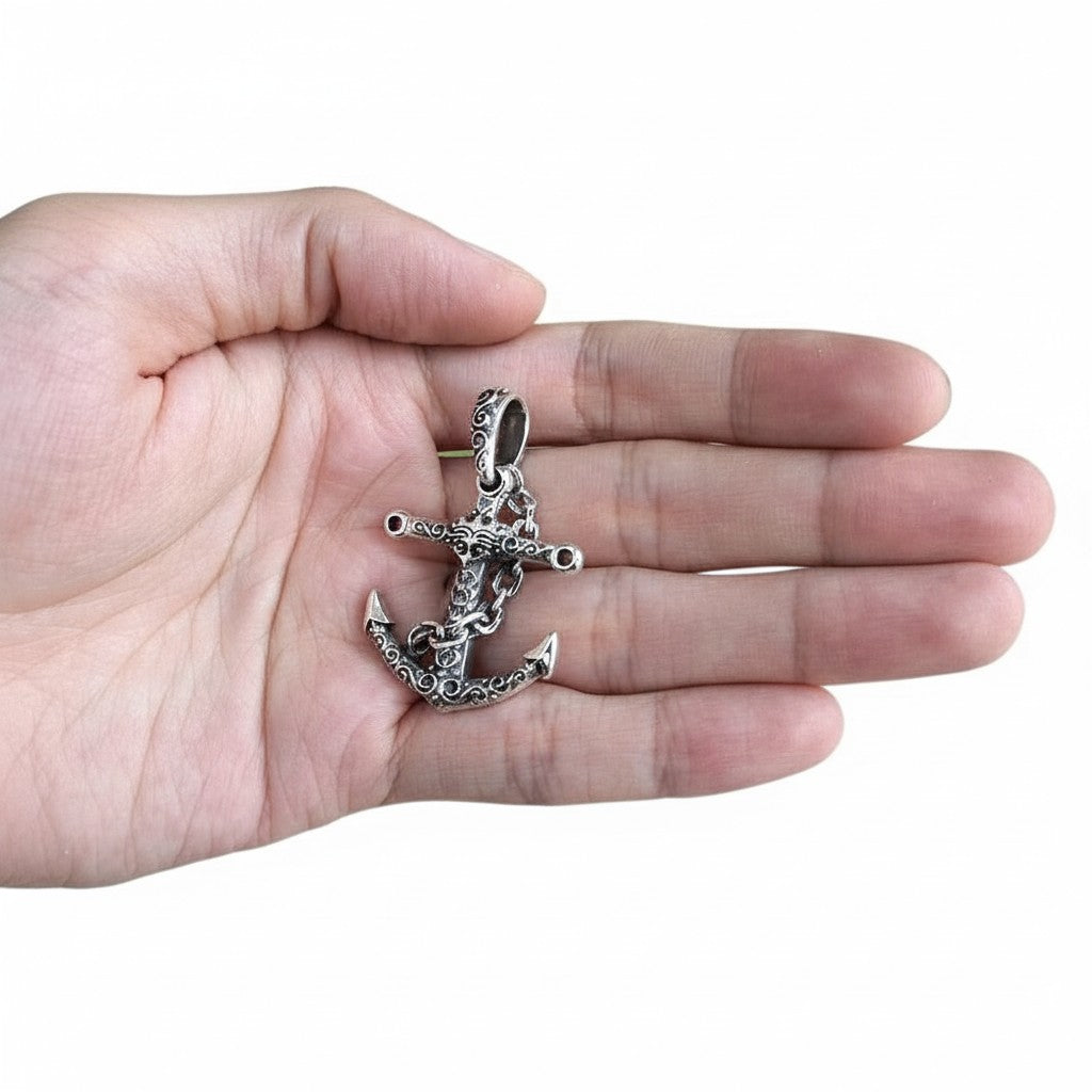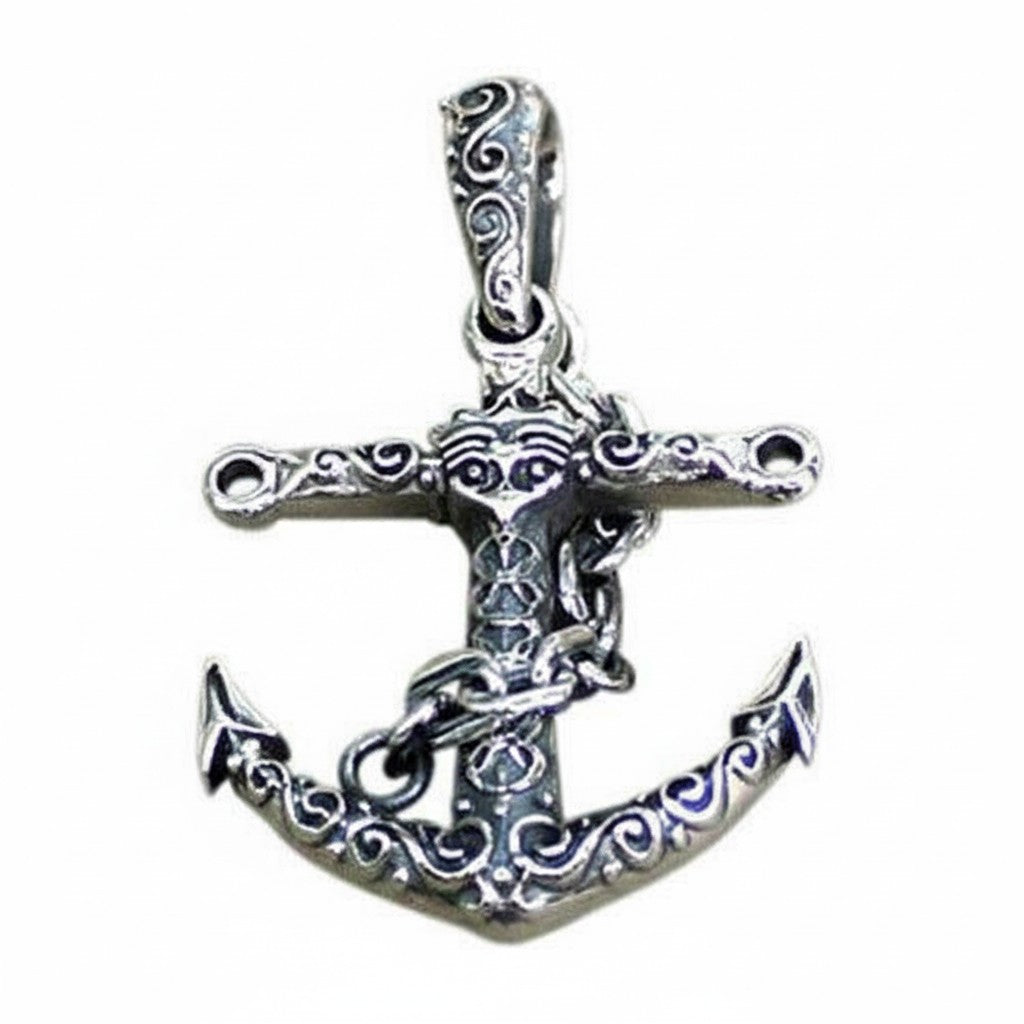 Ennek a medálnak az ereje a klasszikus tengerész szimbolika és a kifinomult, ősi művészet ötvözetében rejlik. Az alap egy időtlen horgony, amely a stabilitást és a biztonságos hazatérést jelképezi. De ez nem egy egyszerű horgony: teljes felületét örvénylő gótikus és törzsi vésetek díszítik, sötét, oxidált felülettel, amely antik kincs benyomását kelti. A horgony szárára egy formázott lánc tekeredik, még robusztusabb, ipari textúrát adva. Ez egy hordható történet a meggyőződéssel élt életről, erőteljes üzenet annak a férfinak, aki önmaga és mások számára is horgony.