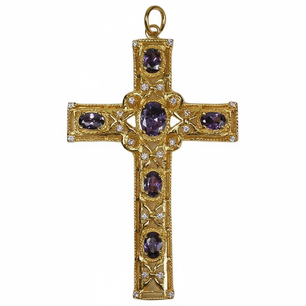 Hordj magaddal egy mély hit és tekintély szimbólumát ezzel a lenyűgöző arany ametiszt püspöki kereszt medállal. A magas rangú egyházi személyek által viselt hagyományos mellkereszt ihlette, ez a pompás egyházi ékszer azoknak készült, akik határozottan szeretnék kifejezni elkötelezettségüket. Mesterien kézzel készült medál, amely egyszerre sugároz spirituális jelentőséget és időtlen eleganciát.