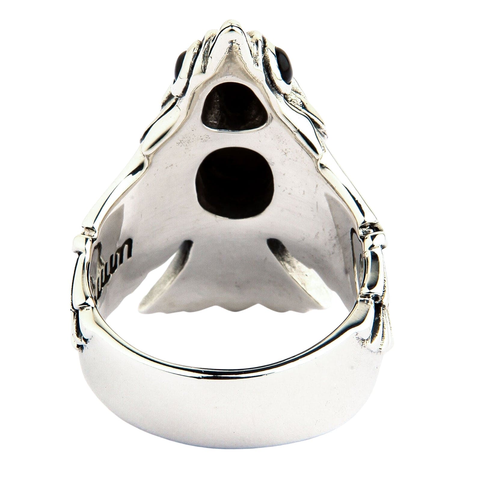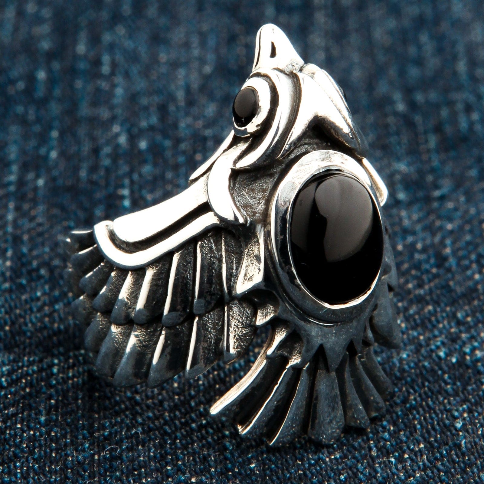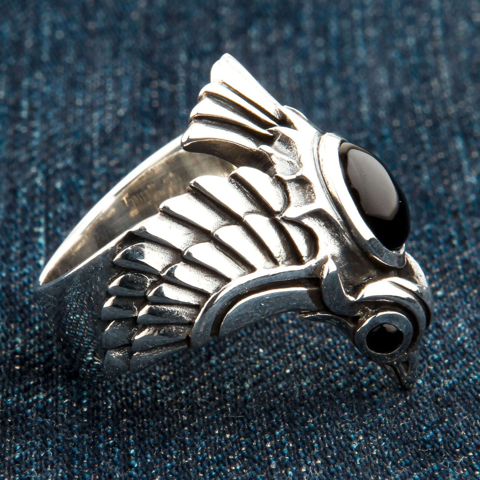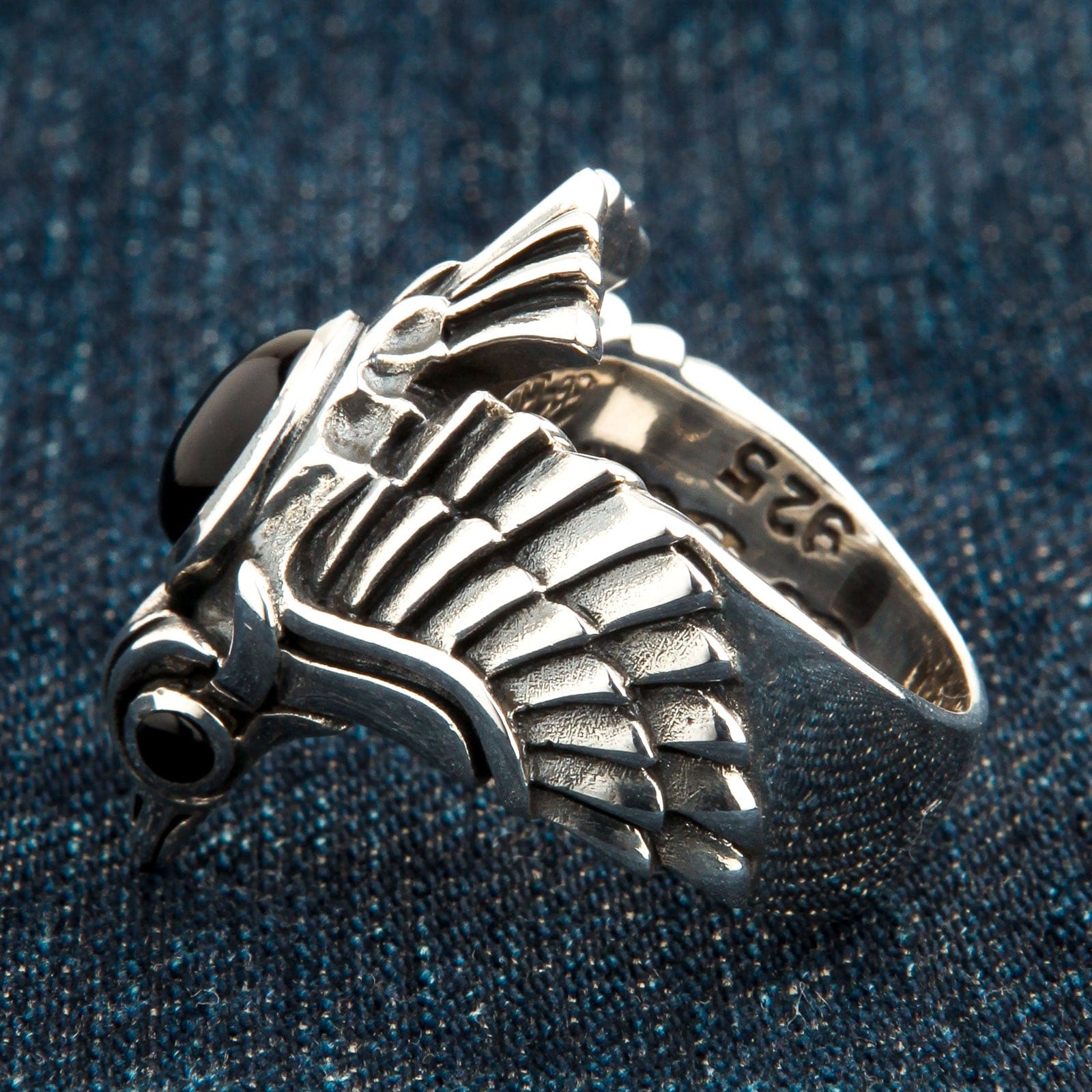 Ennek a gyűrűnek a zsenialitása a zökkenőmentes, teljes testet ábrázoló kialakításban rejlik. Nem egyszerűen egy főnixet ábrázol – maga a gyűrű a főnix. A hatalmas, nemes főnixfej uralja az ékszer előlapját, tekintete átható és mindentudó. A madár mellkasán egy nagy, polírozott fekete ónix kaboson díszeleg, amelyet évszázadok óta védelmezés, földelés és belső erő szimbólumaként tisztelnek. Innen indulva a főnix réteges, monumentális szárnyai hátrafelé söpörnek, és körbeölelik az ujjad, magát a gyűrűszárat alkotva. Ez a végső mitikus őrző előtti tisztelgés, az újjászületés örök szimbóluma. A lenyűgöző 28 grammos tömör ezüst remekmű súlya és jelenléte tökéletesen tükrözi a legendás lényt, amelyet megidéz.