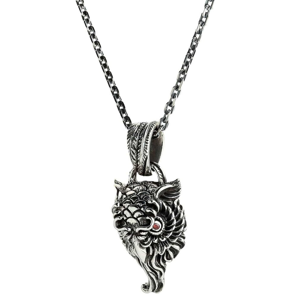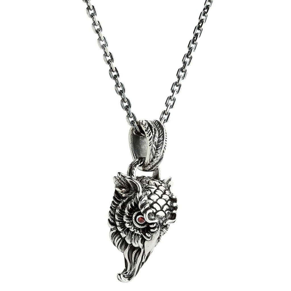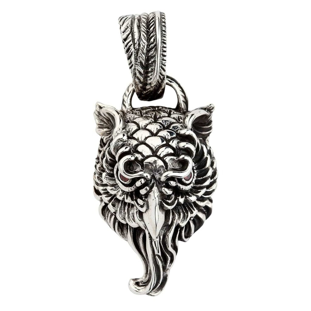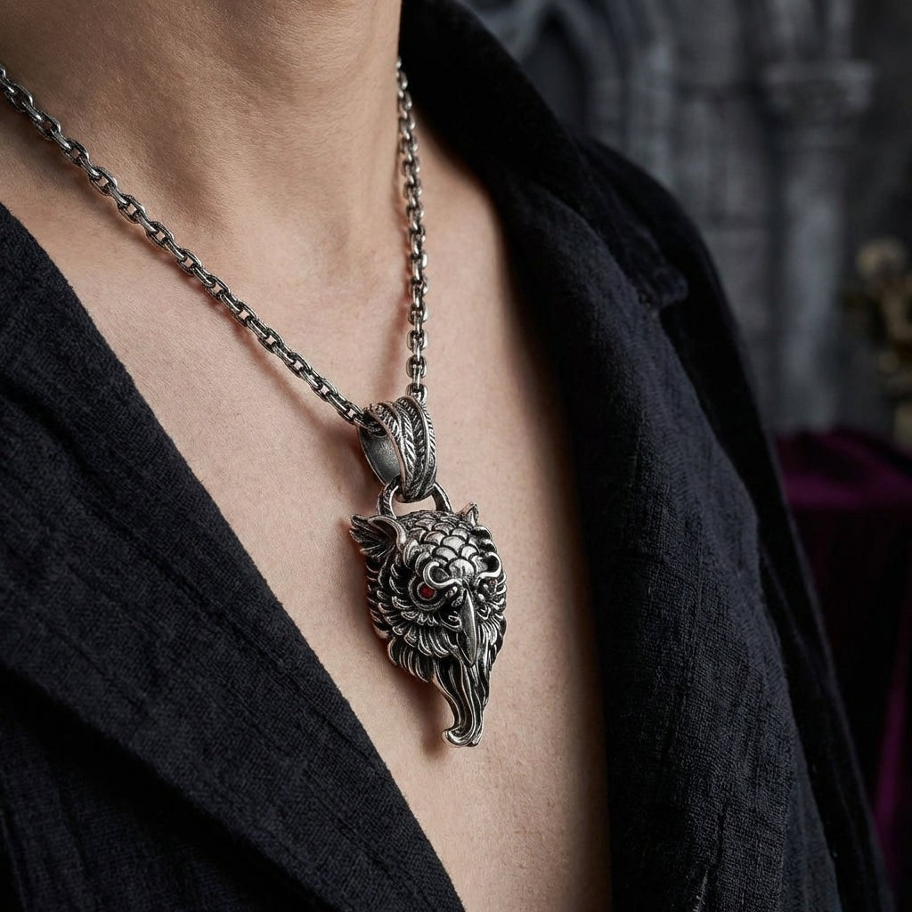 Ez a medál a textúra és az intenzitás igazi mesterműve. Az egész darab egy mesterien megformált bagolyfej, amelynek vad és éber tekintetét elképesztő részletességgel örökítették meg. A felületet bonyolult tollazat borítja, amely egészen a díszes akasztóig folytatódik, minden tollat sötét, oxidált bevonat emel ki, lenyűgöző, élethű mélységet adva. A mély szemüregekből két ragyogó, mélyvörös cirkónia kő izzik. Ezek a tüzes szemek a bölcs baglyot a szenvedélyes bölcsesség és a természetfeletti erő szimbólumává emelik—egy élő, félelmetes intelligenciává. A maga 21 grammos súlyával ez a hordható műalkotás éppoly erőteljes, mint a lény, amelyet ábrázol.