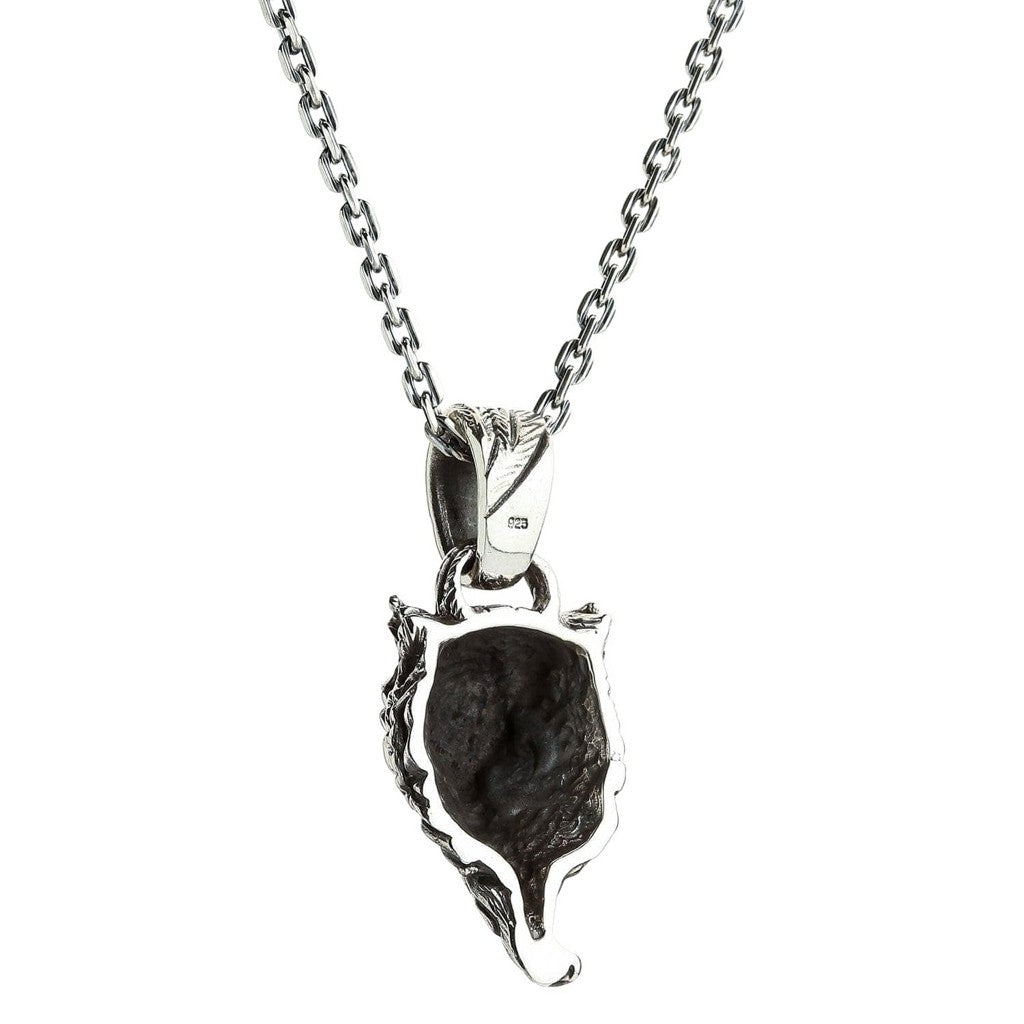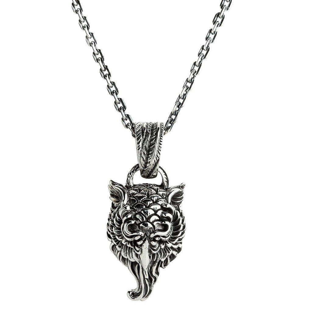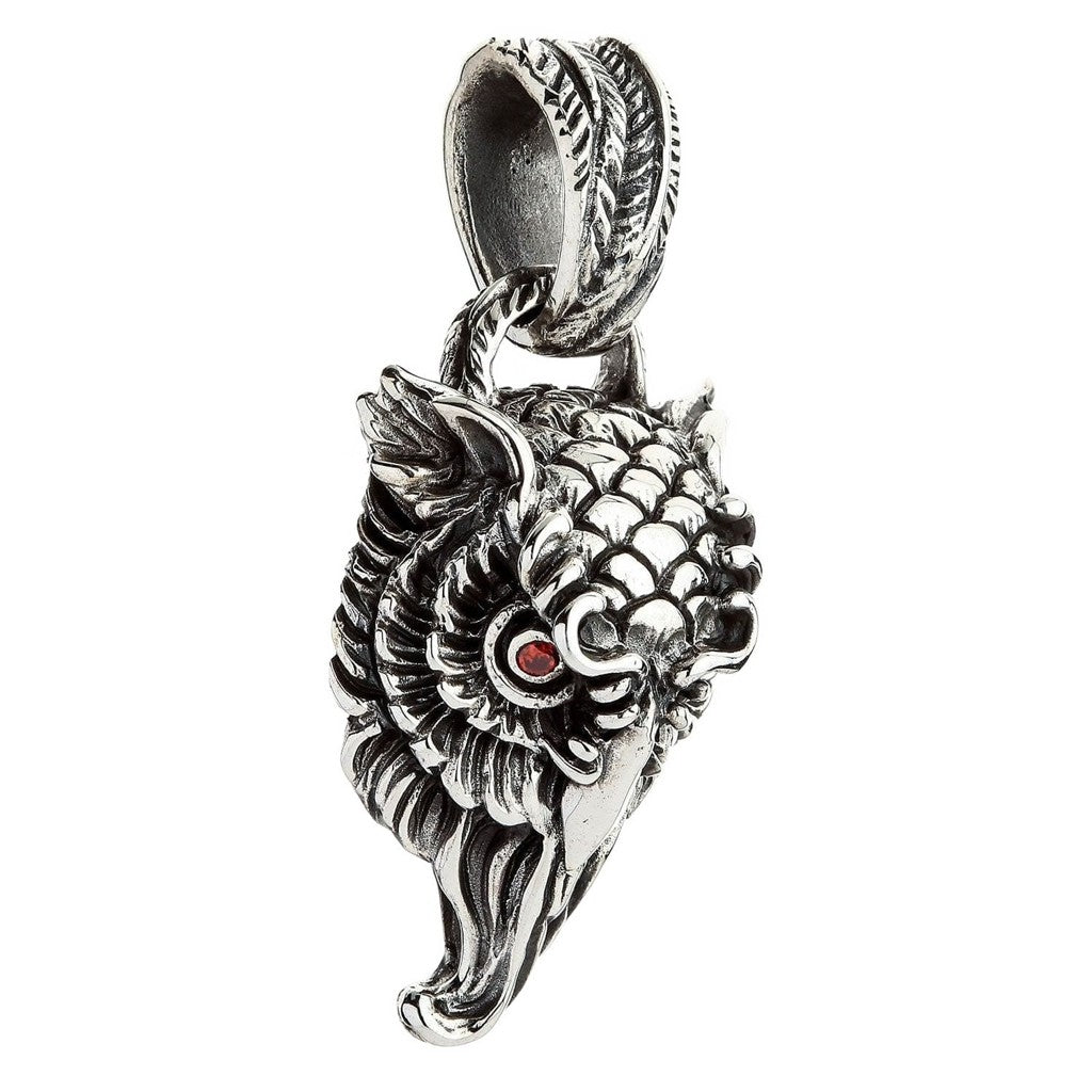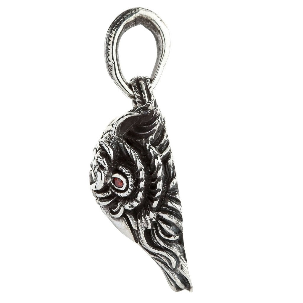 Ez a medál a textúra és az intenzitás igazi mesterműve. Az egész darab egy mesterien megformált bagolyfej, amelynek vad és éber tekintetét elképesztő részletességgel örökítették meg. A felületet bonyolult tollazat borítja, amely egészen a díszes akasztóig folytatódik, minden tollat sötét, oxidált bevonat emel ki, lenyűgöző, élethű mélységet adva. A mély szemüregekből két ragyogó, mélyvörös cirkónia kő izzik. Ezek a tüzes szemek a bölcs baglyot a szenvedélyes bölcsesség és a természetfeletti erő szimbólumává emelik—egy élő, félelmetes intelligenciává. A maga 21 grammos súlyával ez a hordható műalkotás éppoly erőteljes, mint a lény, amelyet ábrázol.