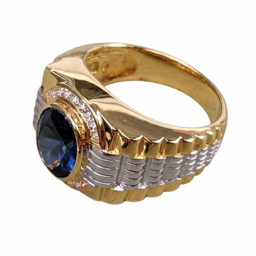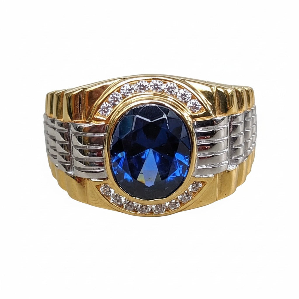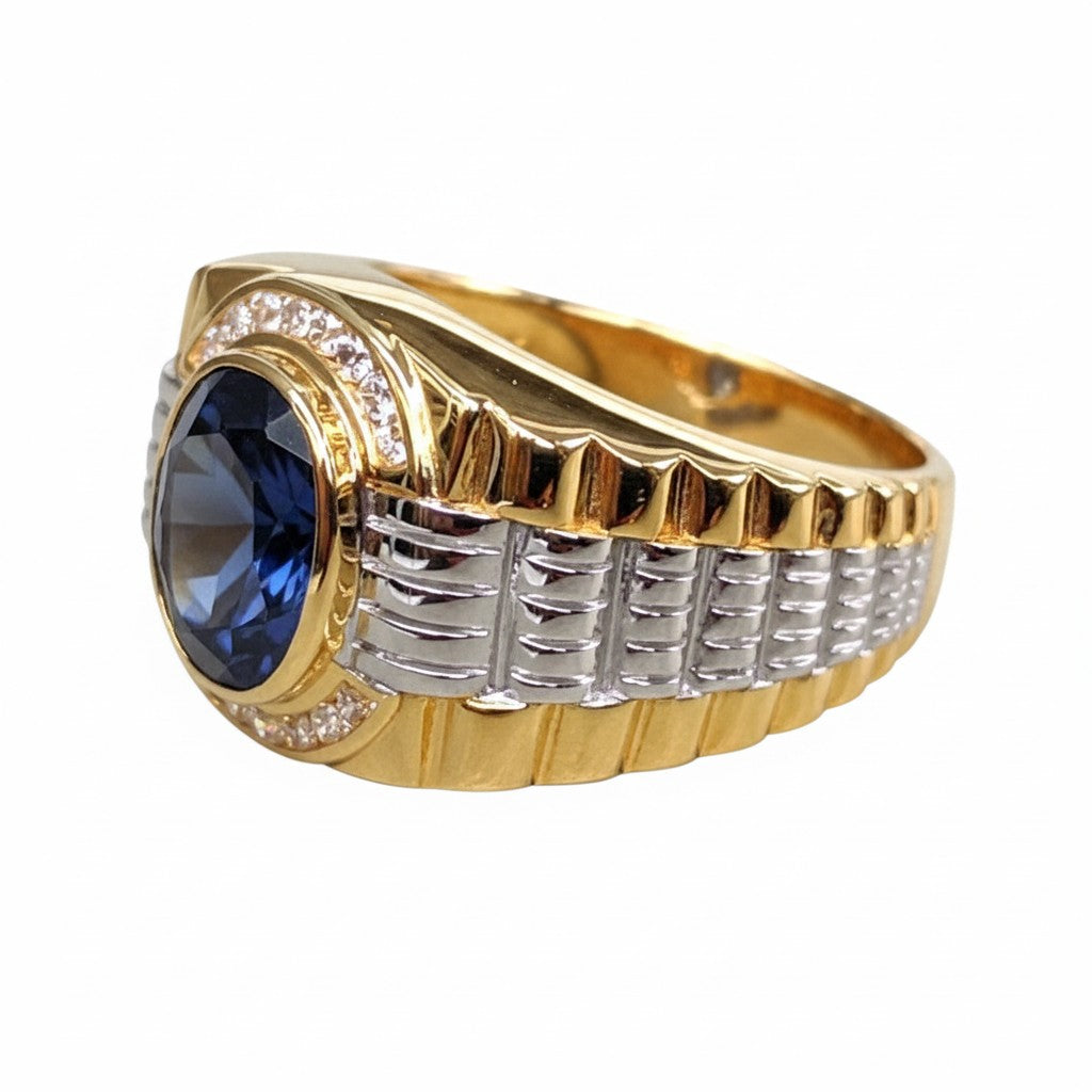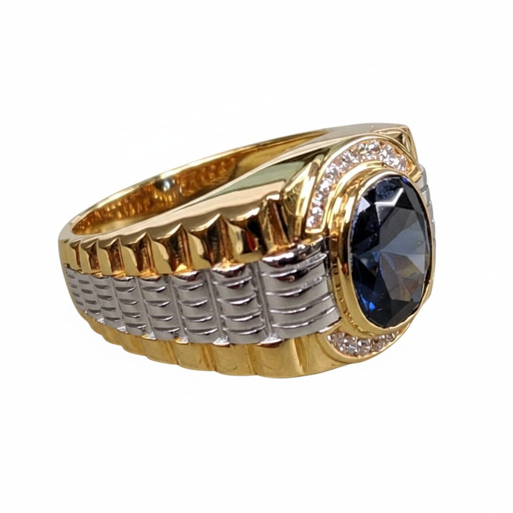 A dizájnt az ikonikus Rolex-stílusú óraszíj ihlette. A szíj jellegzetes két tónusú „szemekből” áll – egy polírozott aranyozott alapból, amelyet tömör 925 ezüst „középső szemek” díszítenek. Ez az óraszíj motívum azonnal felismerhető, és egyedi, órás hangulatot kölcsönöz. A nagy, 11x13 mm-es kék zafír biztonságosan van rögzítve, és 16 ragyogó, tiszta CZ kőből álló glória veszi körül, amely minden szögből lenyűgöző csillogást biztosít a gyűrűnek. Ez egy nehéz, 11 grammos darab, amely olyan masszív, mint amilyennek látszik.