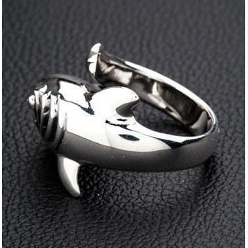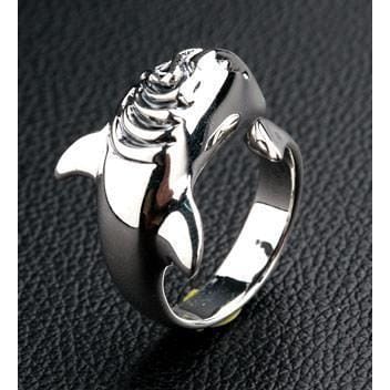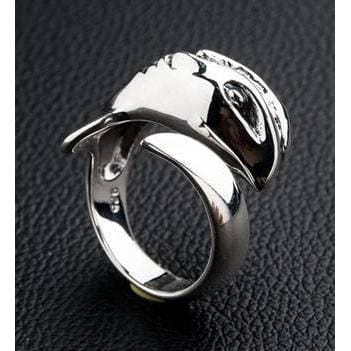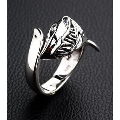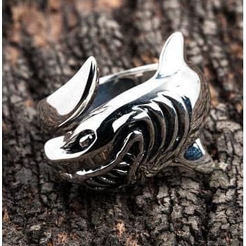 Ennek a gyűrűnek a zsenialitása a folyékony, körbefonódó stílusában rejlik. Egy erőteljes és részletgazdag cápa fej, fenyegető fogaival és hideg szemeivel alkotja a gyűrű homlokzatát. Maga a pánt úgy lett kialakítva, mintha a ragadozó izmos teste körbeölelné az ujjat, és a másik oldalon találkozik az erőteljes farokúszóval. Ez a dinamikus illúzió azt kelti, mintha az egész csúcsragadozó az ujjadon tekeredne körbe. Az egész felület ragyogó, polírozott ezüst, a sötét, oxidált felületkezelés mesteri alkalmazásával, amely kiemeli a kopoltyúk és uszonyok részleteit, lenyűgöző, valósághű mélységet teremtve. Az alku nélküli erő és túlélés időtlen szimbólumaként ez a cápa nem csak ül az ujjadon – uralja azt.
