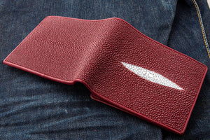 Questa è la "Corona" o "Occhio"—un gruppo centrale di perle più grandi e pronunciate che indica il punto in cui si trovava la pinna dorsale della razza. Questo motivo a stella è una caratteristica chiave che gli artigiani amano mettere in risalto al centro dei loro portafogli. Quando vedi questa corona, sai che stai guardando un portafoglio realizzato con un unico vero pezzo di pelle. Puoi ammirare questa caratteristica iconica e affascinante in questo classico portafoglio nero in pelle di razza, dove l’occhio diventa il naturale punto focale.