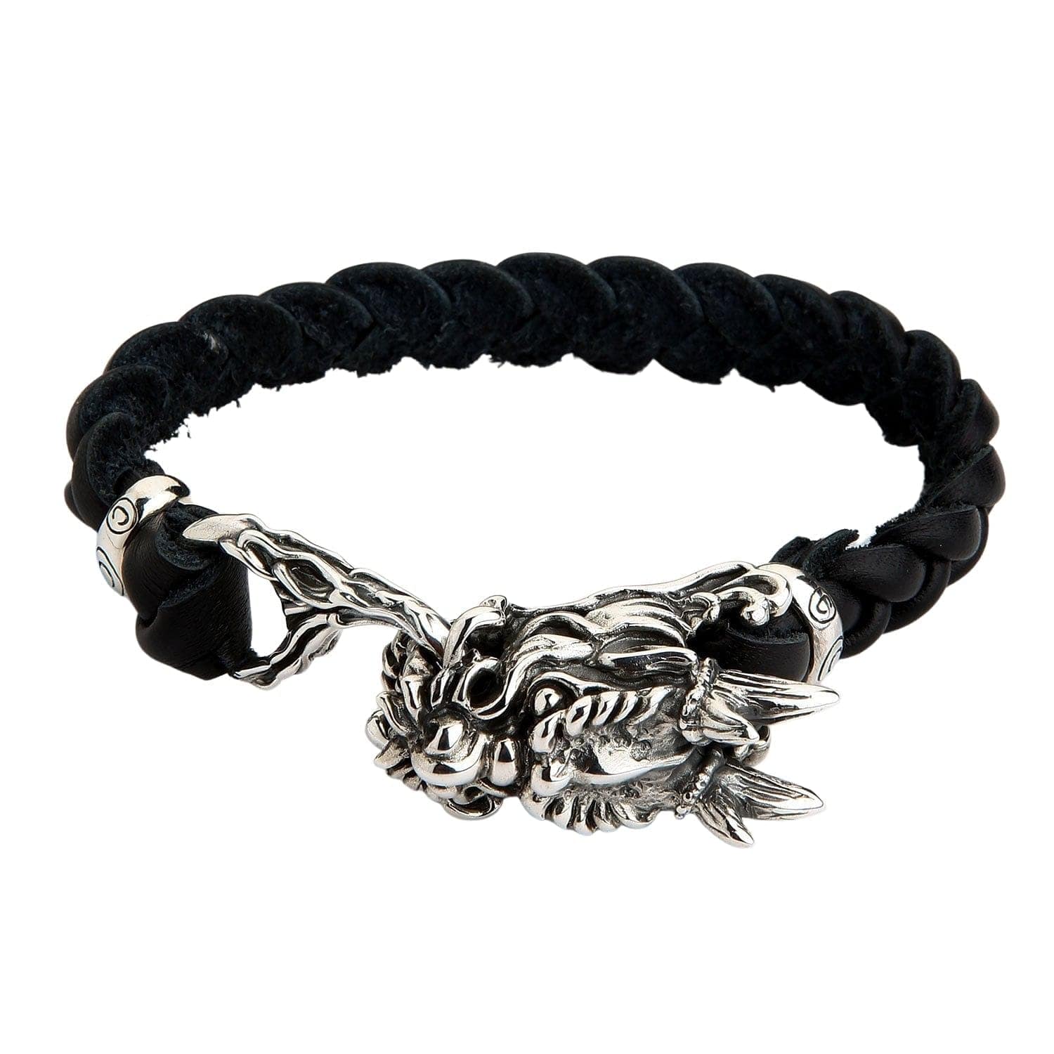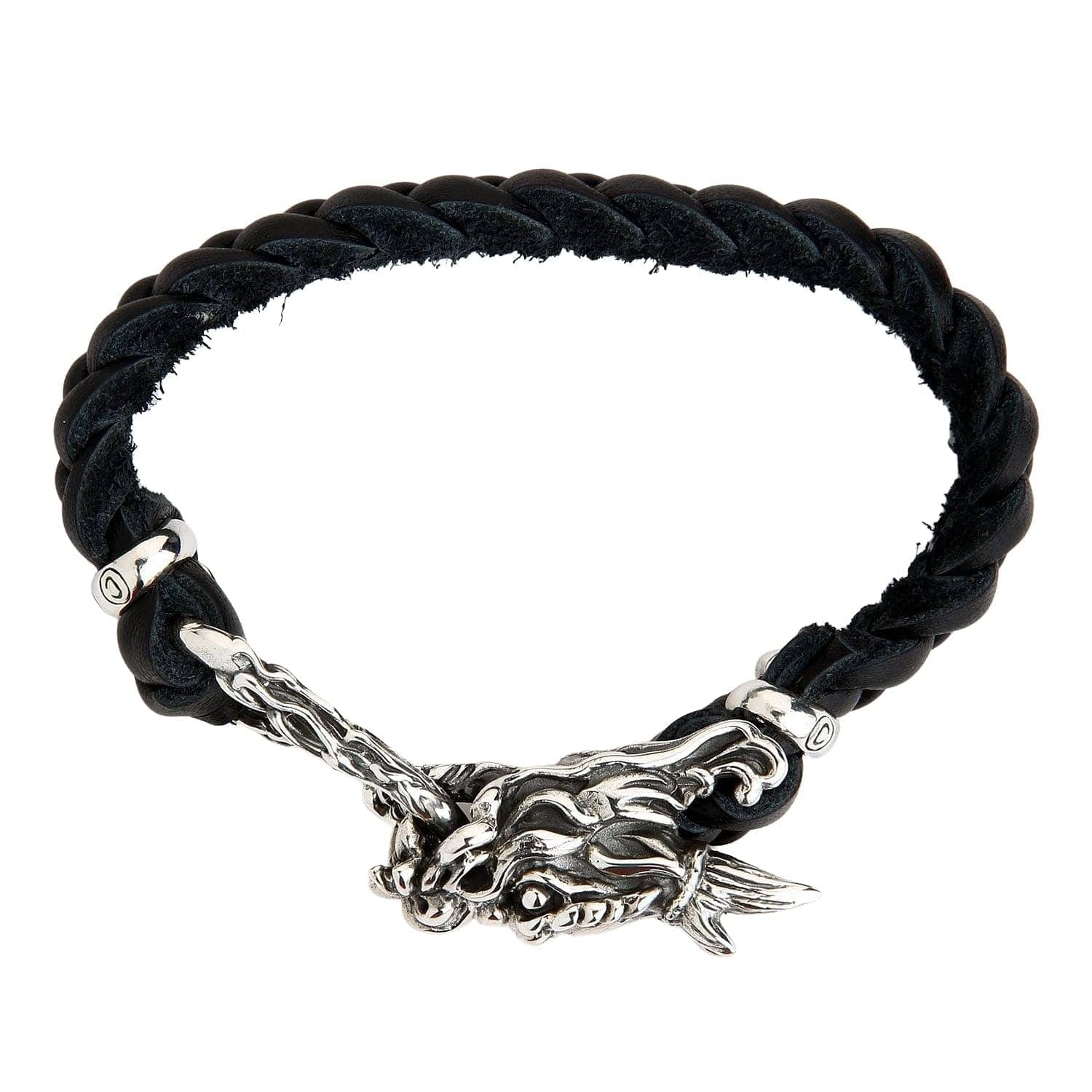 Sterling Silver Dragon Leather Bracelet worn on a male wrist
