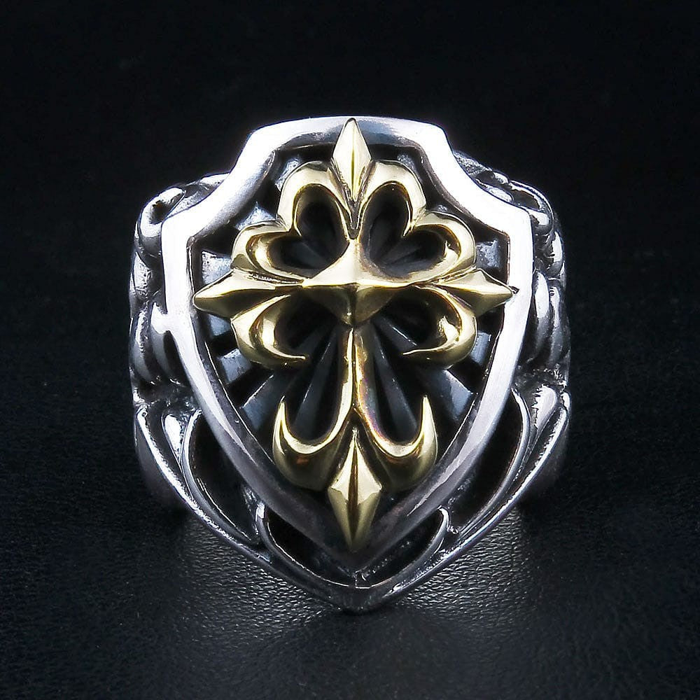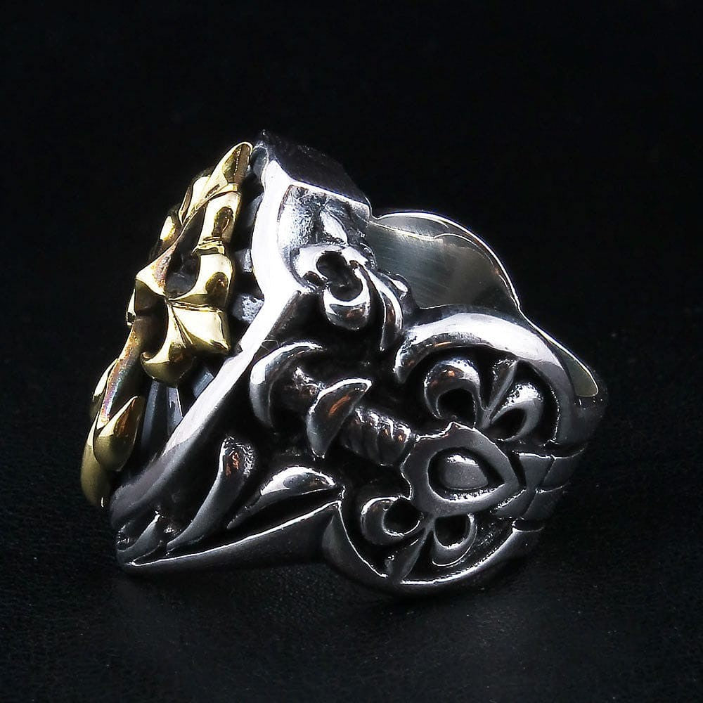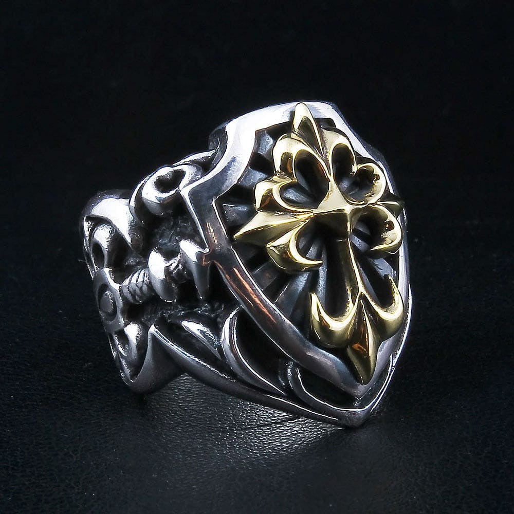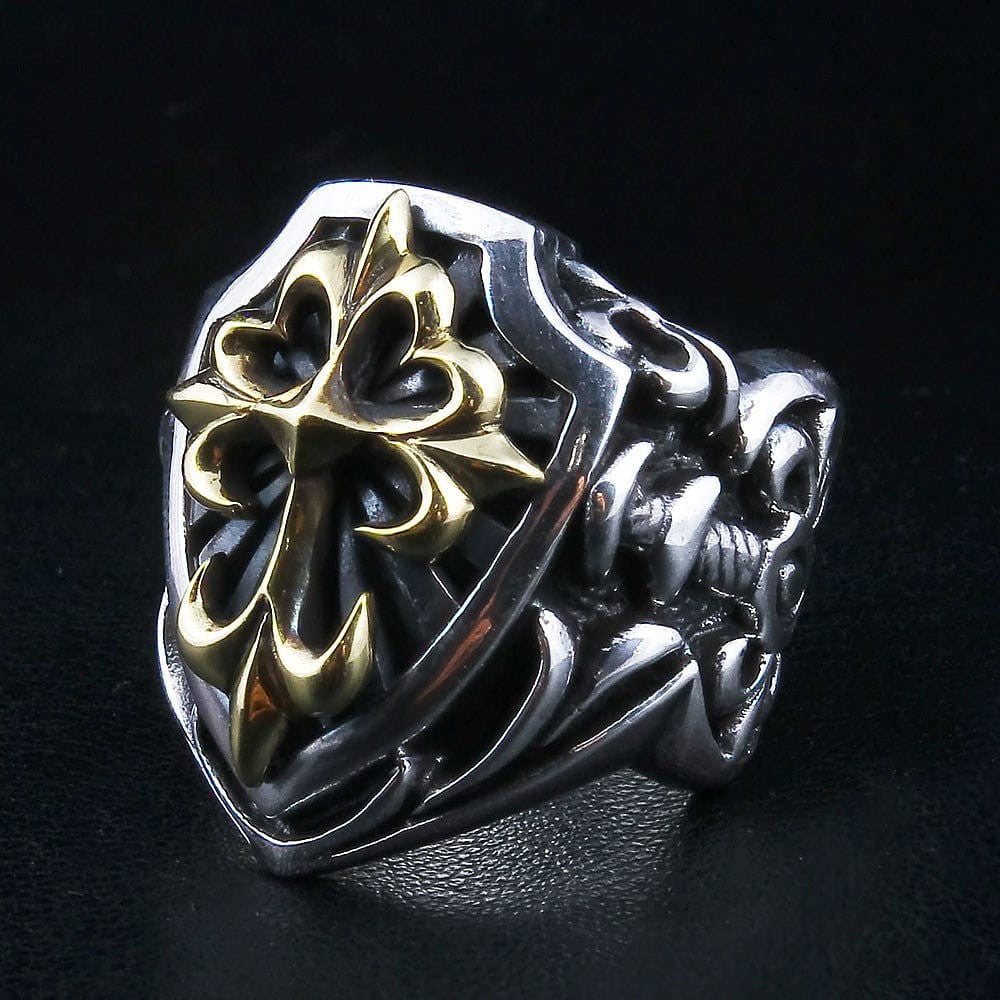 Anello da uomo grande in argento sterling con croce in oro giallo