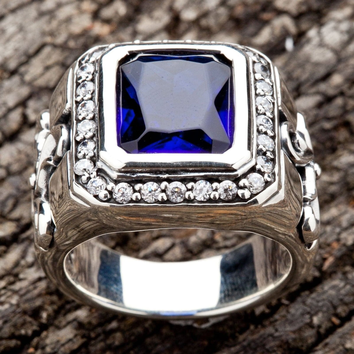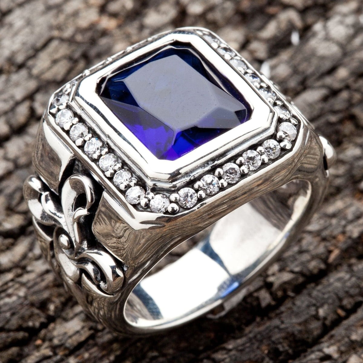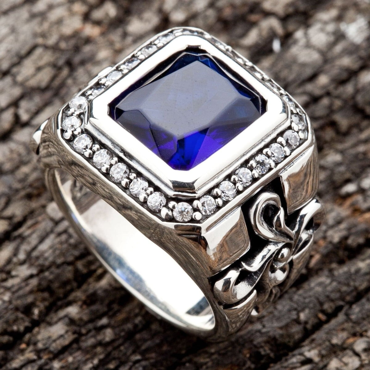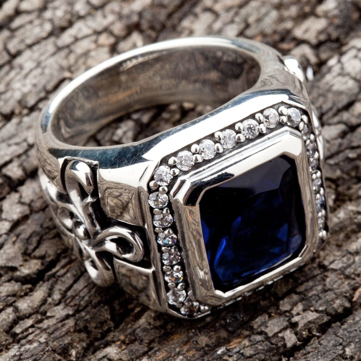 Il fulcro è una grande pietra CZ blu zaffiro taglio smeraldo, un colore da sempre associato al divino, alla saggezza e alla regalità. La tonalità profonda e affascinante della pietra è esaltata da un brillante alone di CZ, con decine di pietre chiare che aggiungono uno scintillio ardente. L’intero anello è sapientemente realizzato a mano in un imponente blocco di 24 grammi di argento sterling .925 massiccio, con una finitura lucida che lo fa brillare con autorevolezza. Scopri altri design nobili nella nostra collezione di Anelli Gotici.
