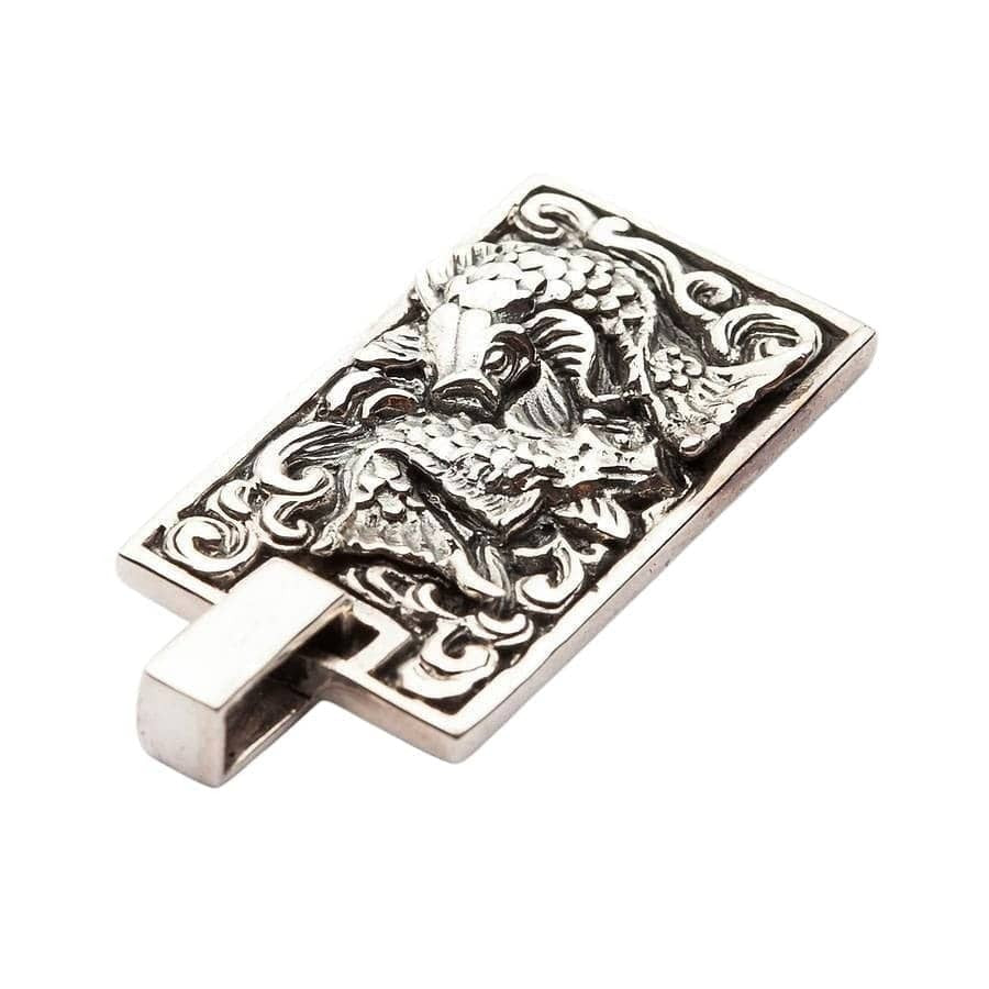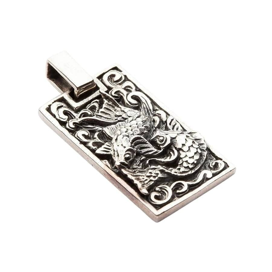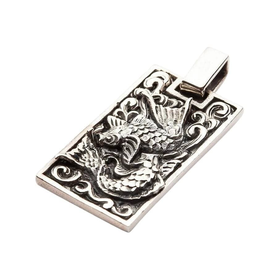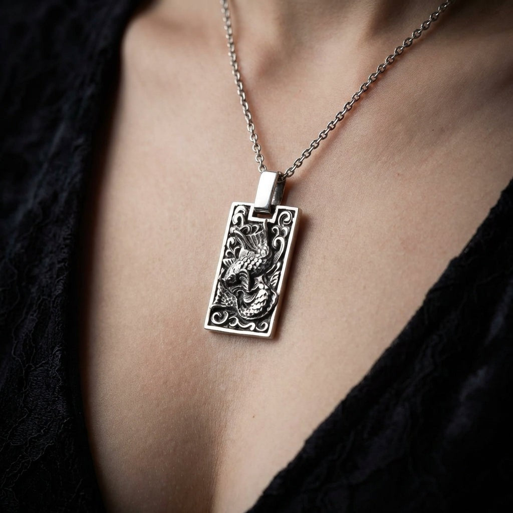 Questo ciondolo cattura la celebre leggenda della carpa Koi. Il pesce tridimensionale realizzato a mano è raffigurato in straordinario dettaglio, con ogni singola squama e pinna ben definita. È mostrato mentre “risale la corrente” tra onde stilizzate e ossidate, simbolo della determinazione nel superare gli ostacoli. Nella cultura giapponese, la Koi che termina il suo viaggio si trasforma in drago, diventando così un potente simbolo di successo e trasformazione. La cornice rettangolare in stile “dog tag” dona a questo antico simbolo un tocco moderno e grintoso.