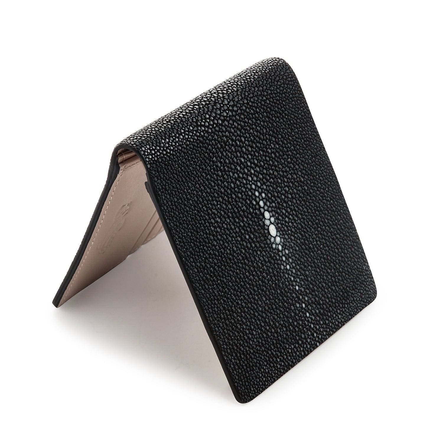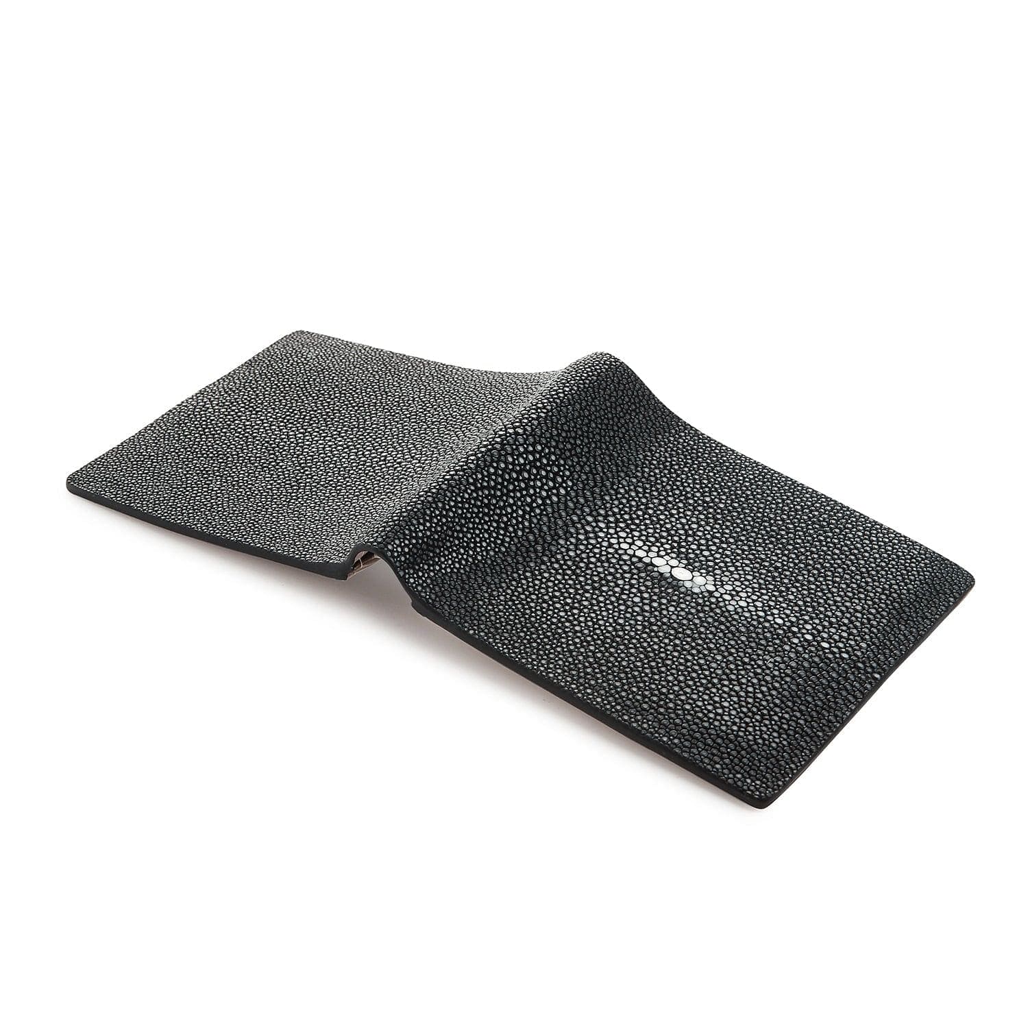 🐟 Pelle di Razza Premium: Presenta un esterno in vera pelle di razza nera (Shagreen), apprezzata per la sua texture granulosa unica, incredibile resistenza (fino a 25 volte più forte del cuoio bovino) e la naturale "perla" bianca.