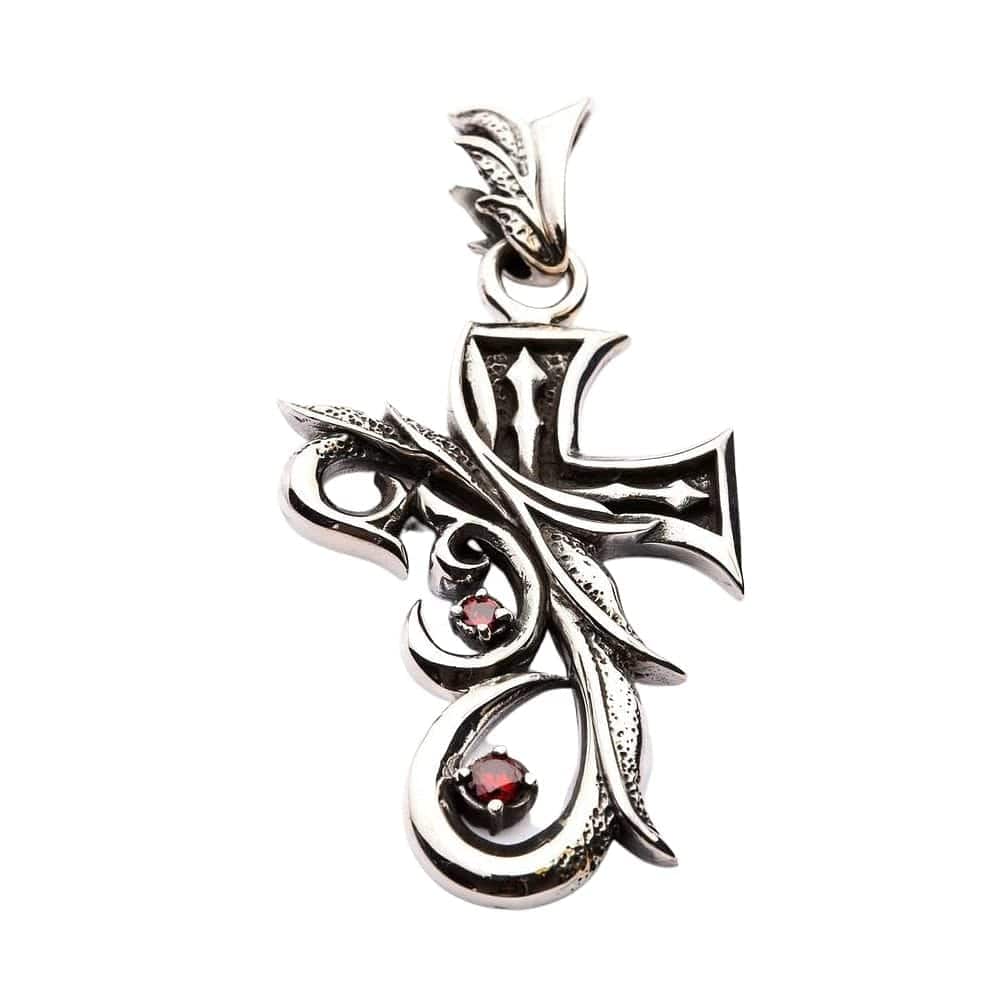 Con vivaci inserimenti in pietra di zirconia cubica rossa, questo pendente offre una brillantezza che contrasta perfettamente con lo stile gotico.