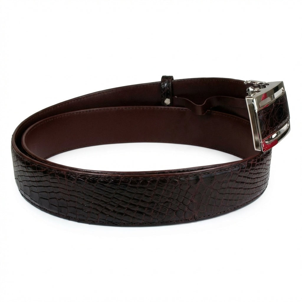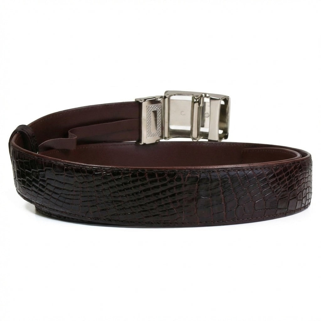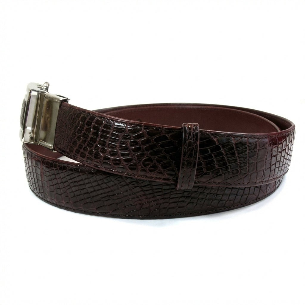 バーガンディ クロコダイルレザー メンズベルトでワンランク上のスタイルを。上質なクロコダイルレザーを熟練の職人が手作業で仕上げ、ラグジュアリーなバーガンディカラーが装いに洗練さをプラス。フォーマルにもカジュアルにもおすすめです。