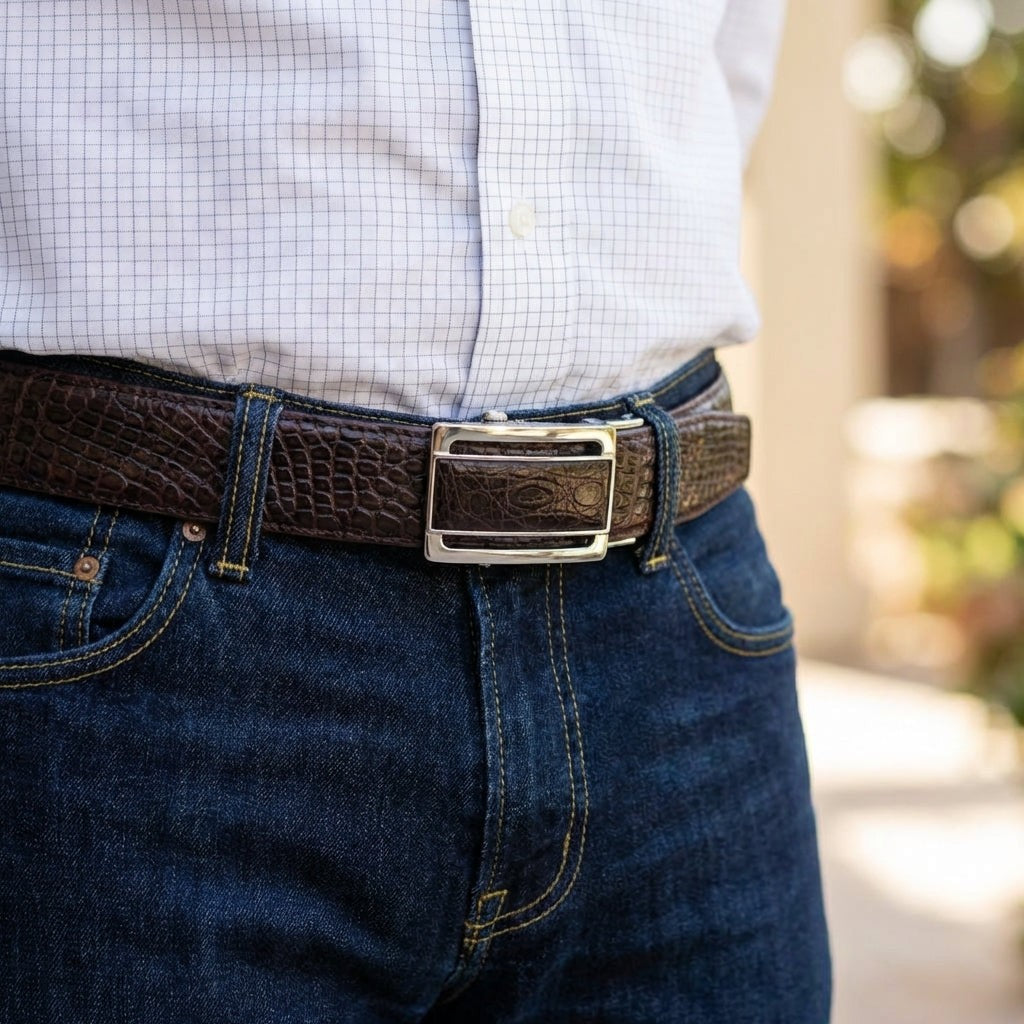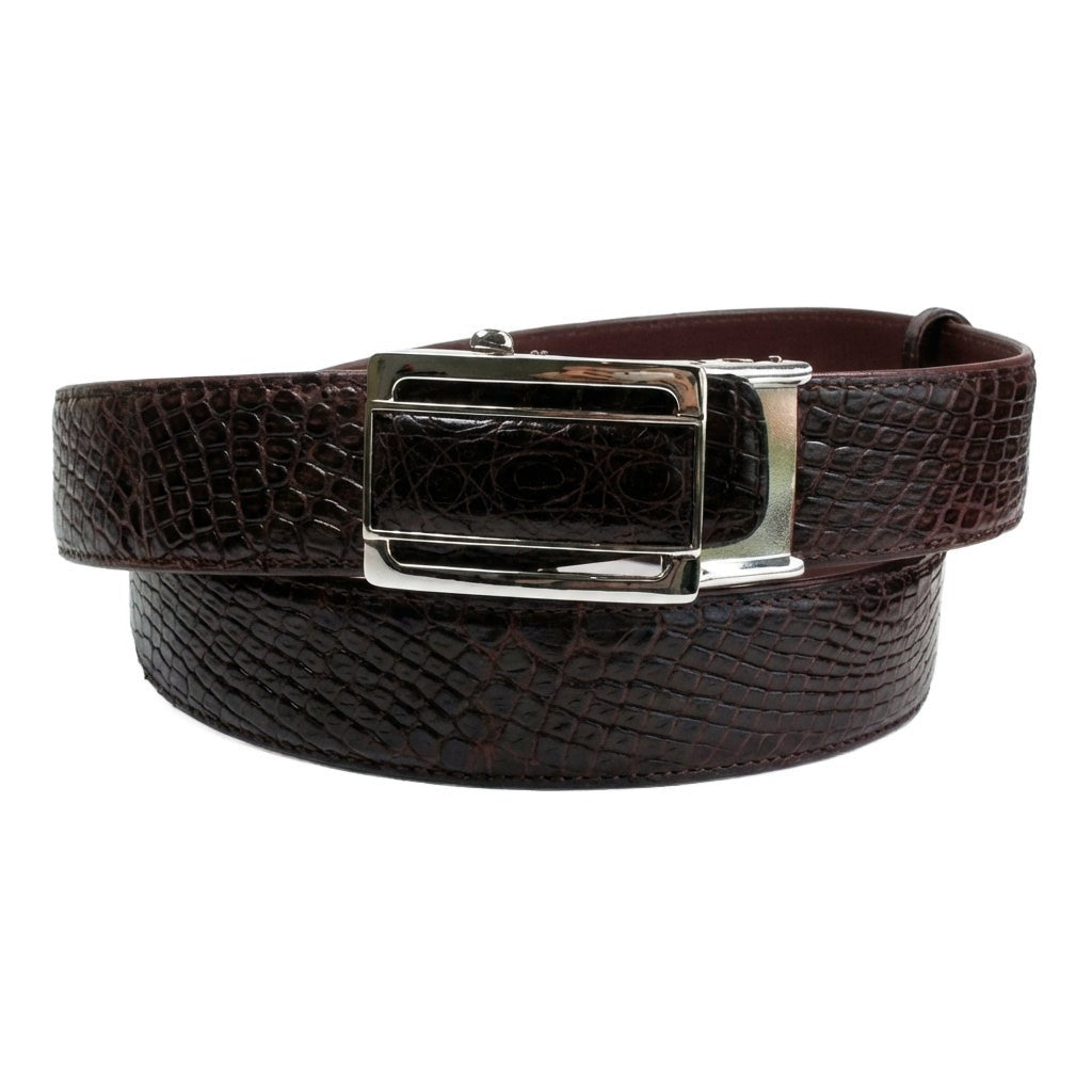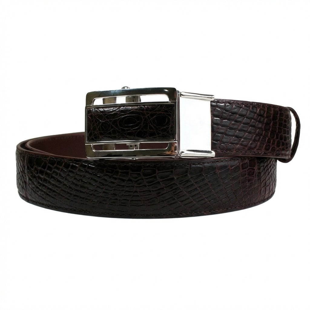 バーガンディ クロコダイルレザー メンズベルトでワンランク上のスタイルを。上質なクロコダイルレザーを熟練の職人が手作業で仕上げ、ラグジュアリーなバーガンディカラーが装いに洗練さをプラス。フォーマルにもカジュアルにもおすすめです。