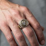 このリングはバランスの物語を語ります。フェイスには精巧に彫刻されたシルバーのマリファナリーフがあり、平和・癒し・スピリチュアルなガンジャの象徴です。聖なる葉を両脇で守るのは2頭の力強いラスタライオン。このユダの獅子はハイレ・セラシエ1世の象徴であり、強さ・勇気・アフリカの王権を表します。ベゼルには「Good Vibrations」と刻まれ、ポジティブでスピリチュアルなメッセージを強調しています。