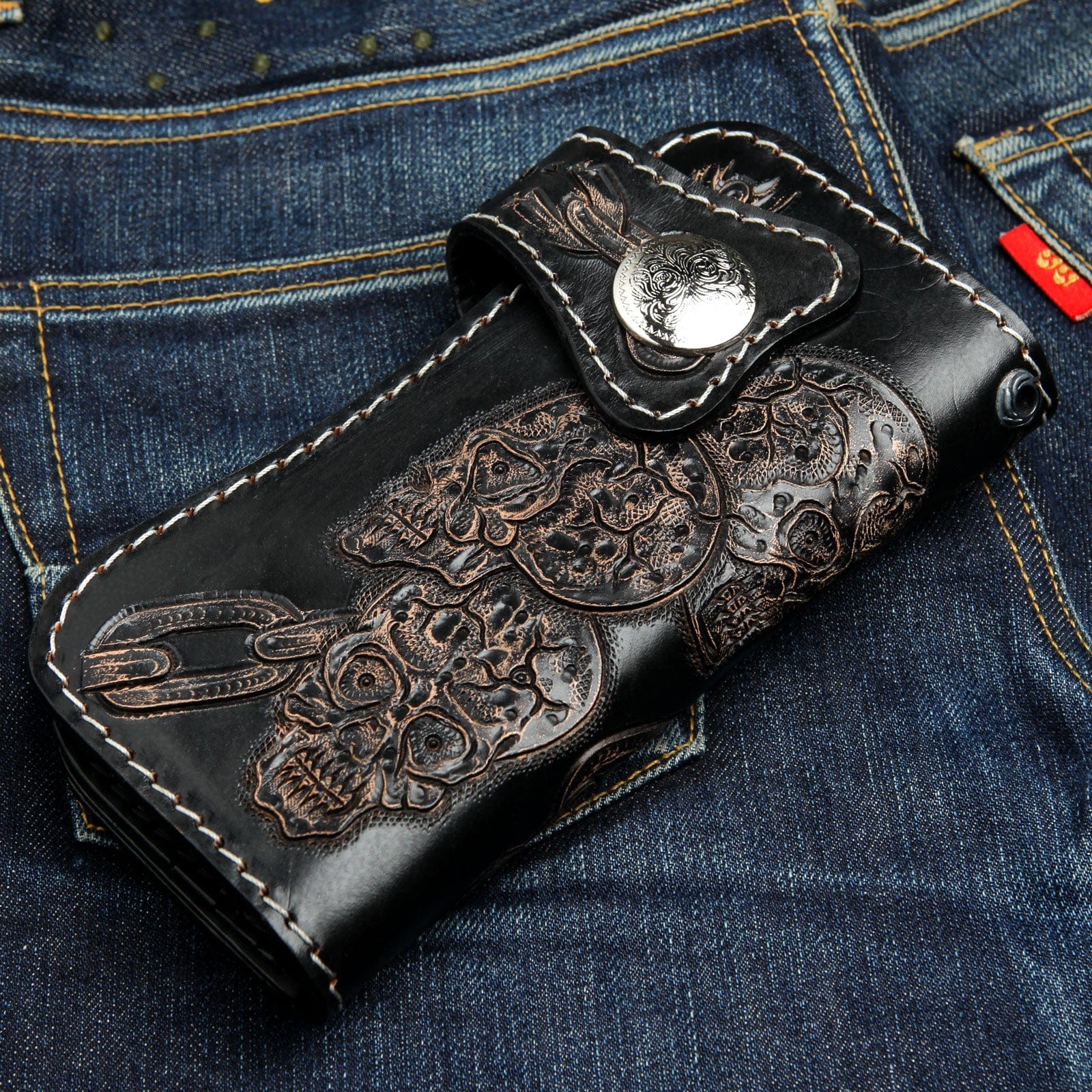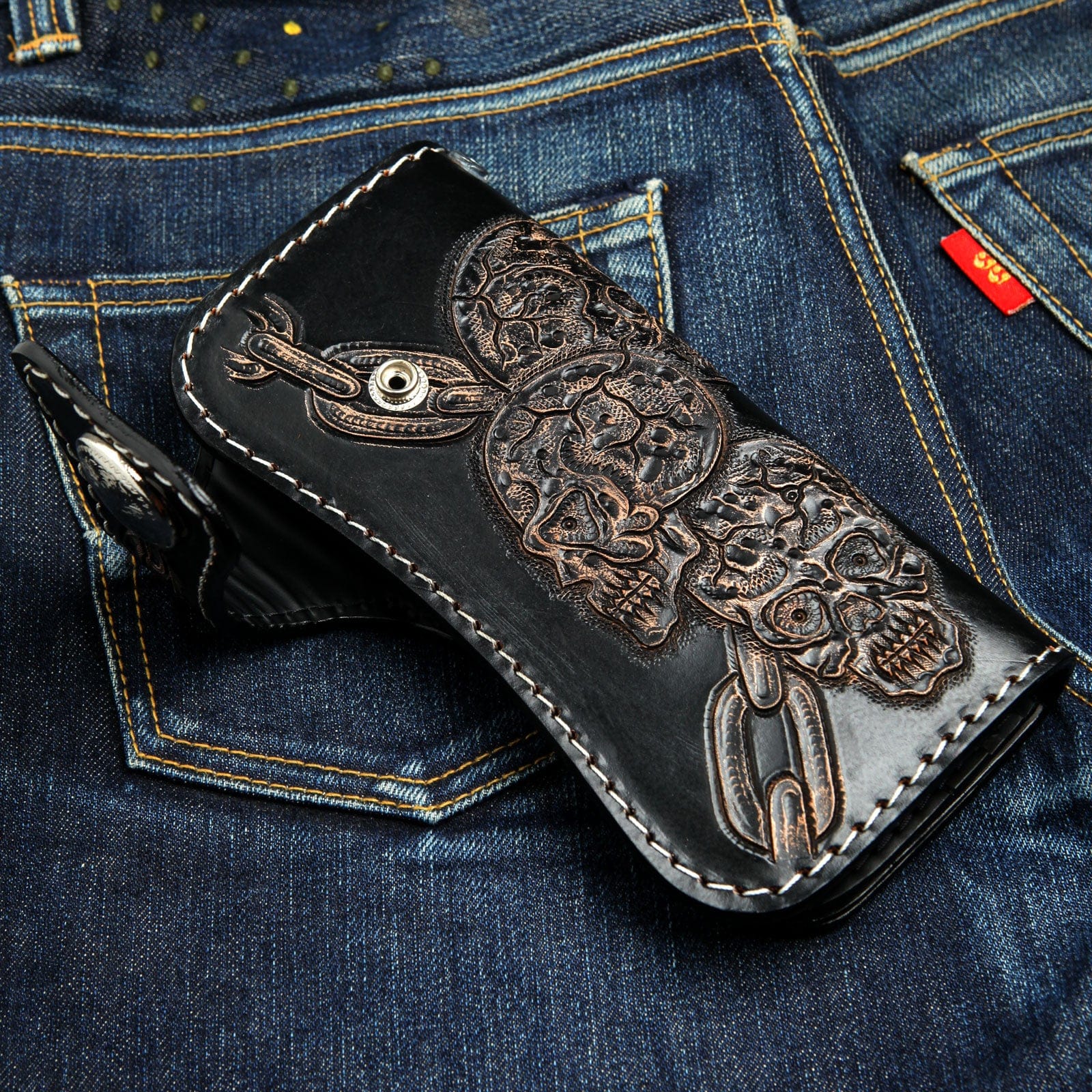 Q: ウォレットのデザインはペイントですか、それとも彫刻ですか? A: デザインはペイントではありません。これは手彫りバイカーウォレットであり、スカルやチェーンのデザインは熟練職人の手で厚いレザーに深く彫刻・刻印されています。そのため、長年使用しても擦れたり消えたりしない立体的で耐久性の高いデザインです。