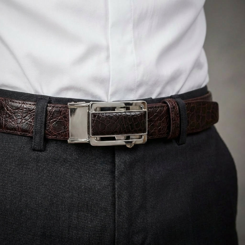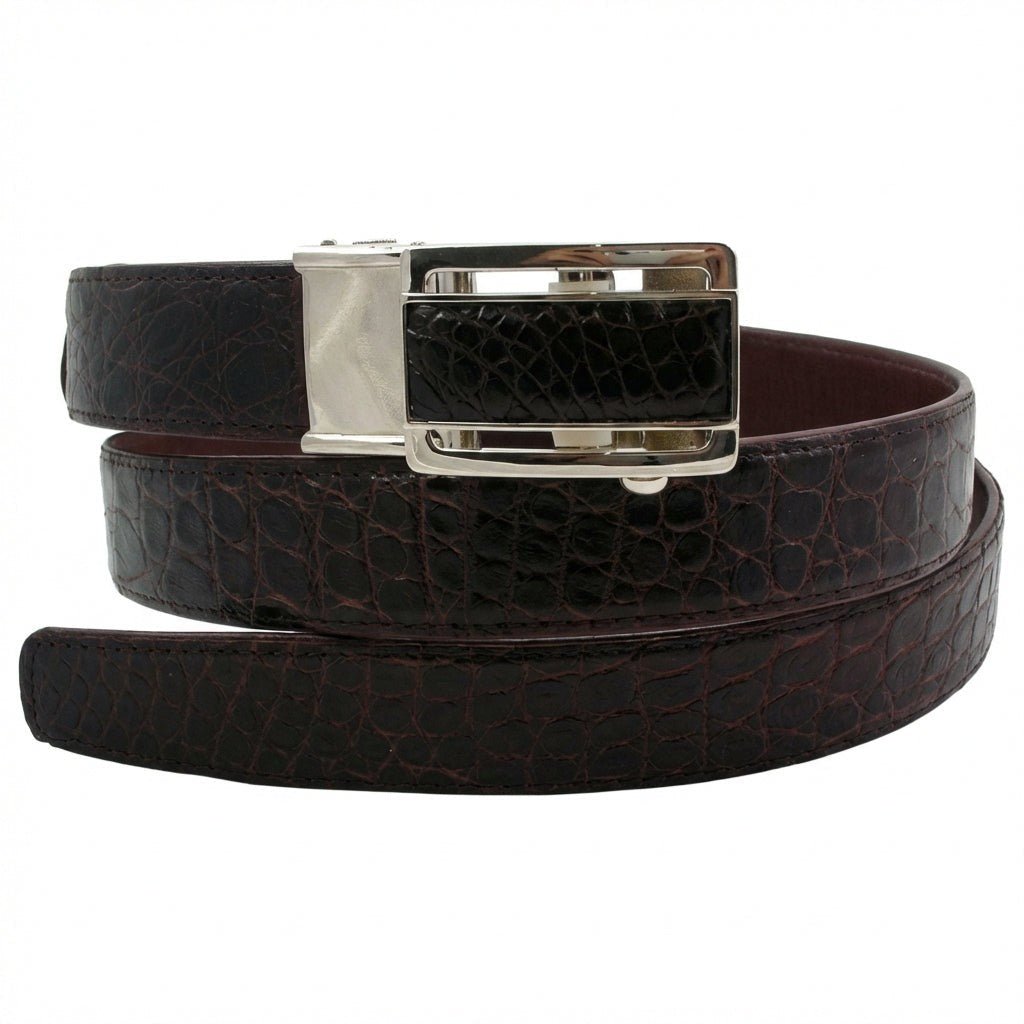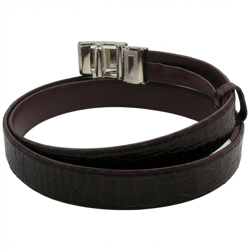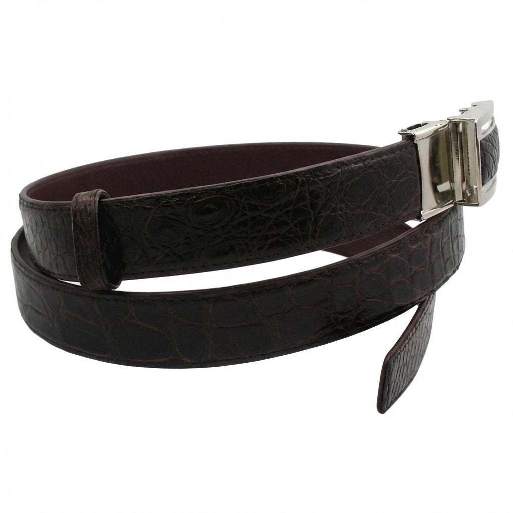 洗練された雰囲気と時代を超えた魅力を演出する、ダークブラウン クロコダイルレザー メンズベルト。高品質なクロコダイルレザーを使用し、エレガンスと耐久性を兼ね備え、フォーマルにもカジュアルにも最適です。