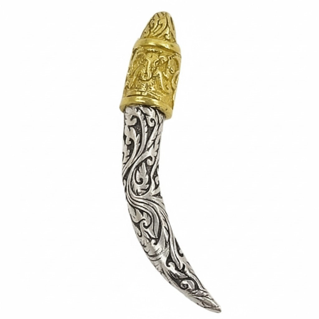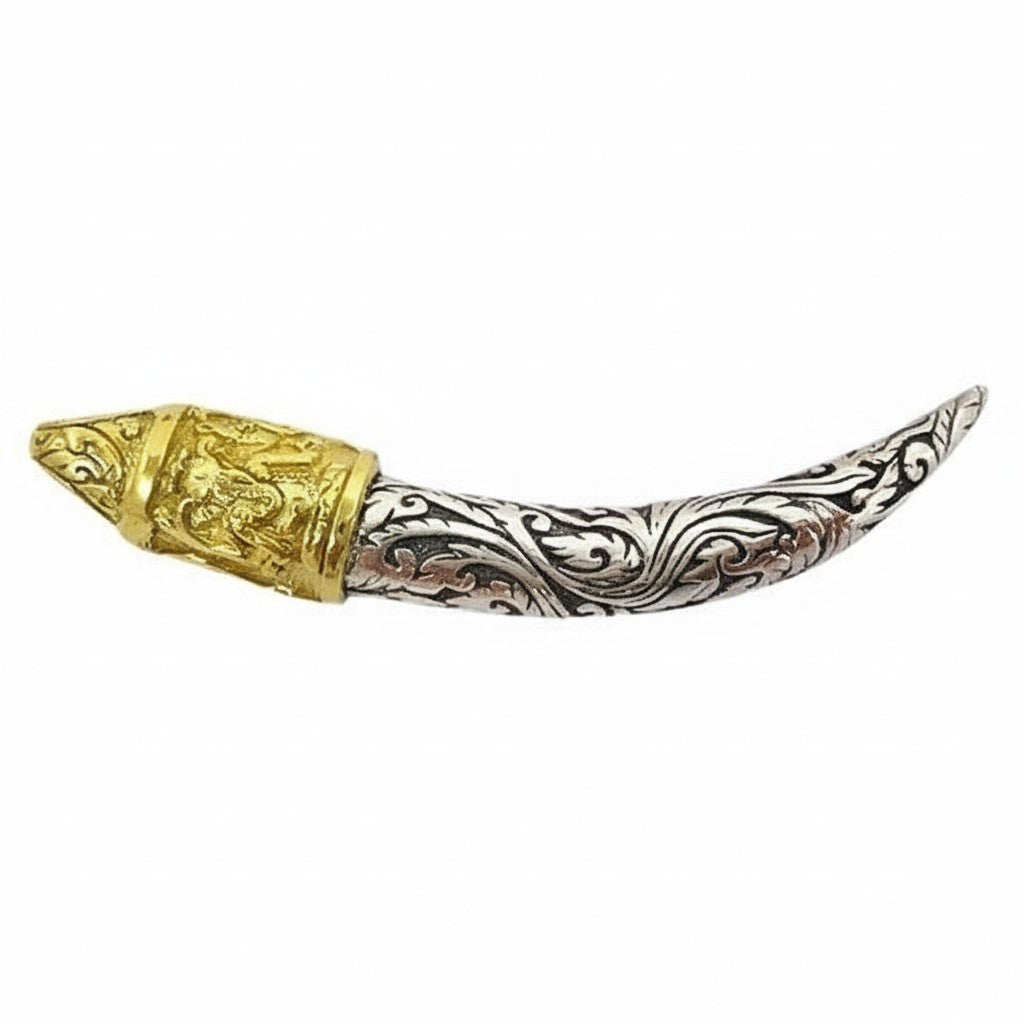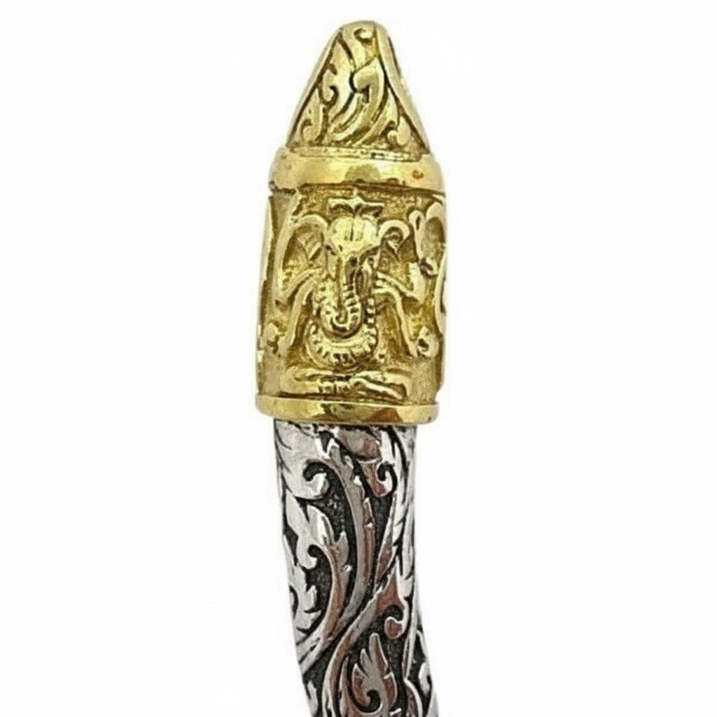 ガネーシャの牙をモチーフにした真鍮×スターリングシルバー製ペンダントで、熟練の職人が.925純銀を用いて丁寧に手作りしました。力強さと知恵を象徴するガネーシャにインスパイアされた、伝統的なトライバルフローラル模様が精巧に彫刻された個性的なデザイン。美しい14K金メッキ真鍮の装飾がアクセント。サイズは12mm×60mm、重さ約11gで、日常使いにも特別な日にも映える存在感と快適な着け心地です。一点一点手作業で磨き上げられ、彫刻の美しさが際立ちます。.925ホールマーク入りで、高品質と本物の銀の純度を保証します。
