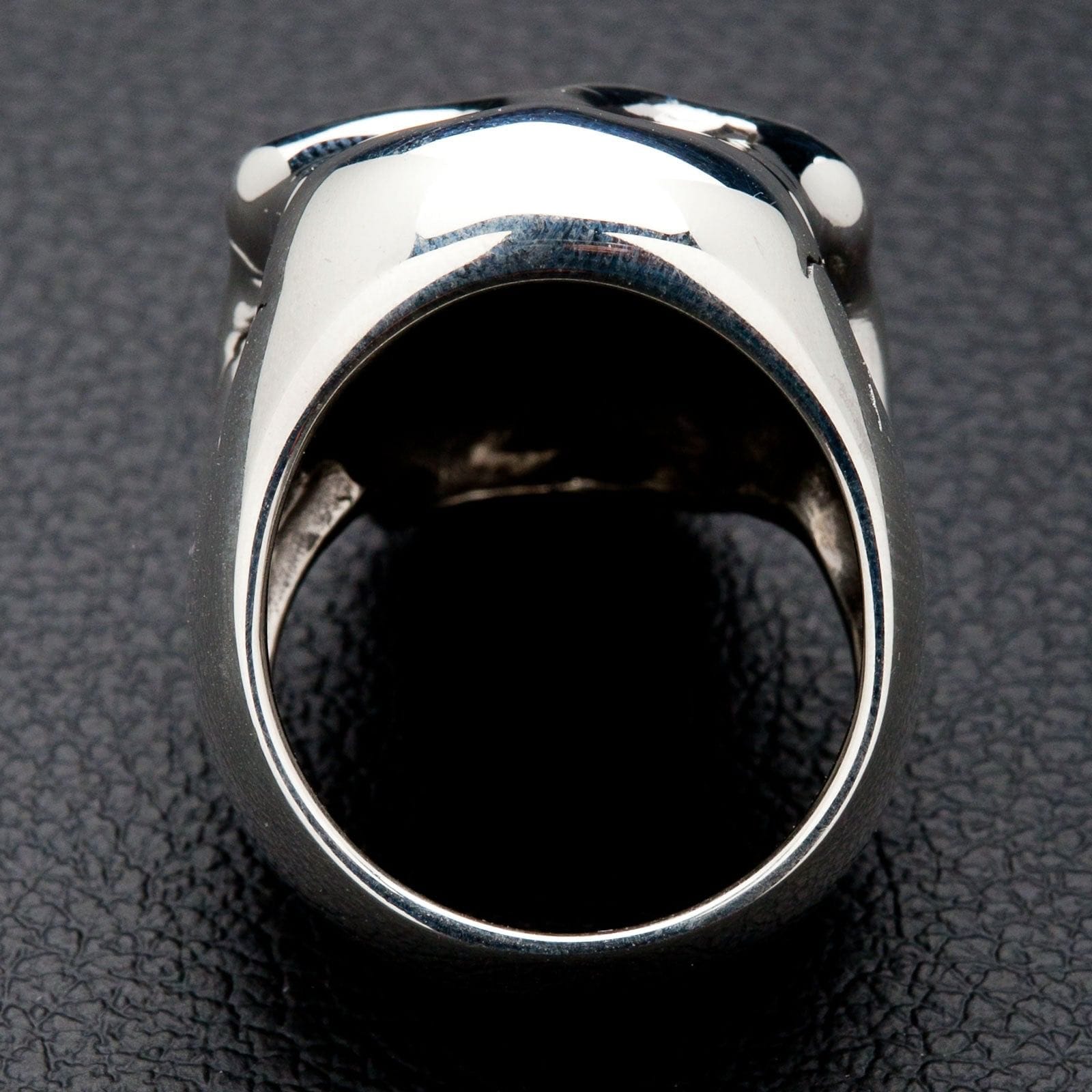 このリングの真髄は、そのパラドックスにあります。圧倒的な力強さと優雅な洗練を併せ持つデザイン。人間の頭蓋骨をスタイリッシュかつ英雄的に解釈し、力強くクリーンなラインと力感のある顎が特徴です。全体は職人による手磨きで仕上げられ、鏡面のような輝きを放ち、液体クロームのような美しさ。まばゆい輝きが、眼窩や鼻腔の深い闇と劇的なコントラストを生み出します。これは単なるスカルではなく、洗練された死生観のステートメント。現代アンダーグラウンドの貴族に捧げるメメント・モリです。最大の特長はその重厚感。31グラムものスターリングシルバーの塊で、見た目通りの圧倒的な存在感とパワーを実感できます。