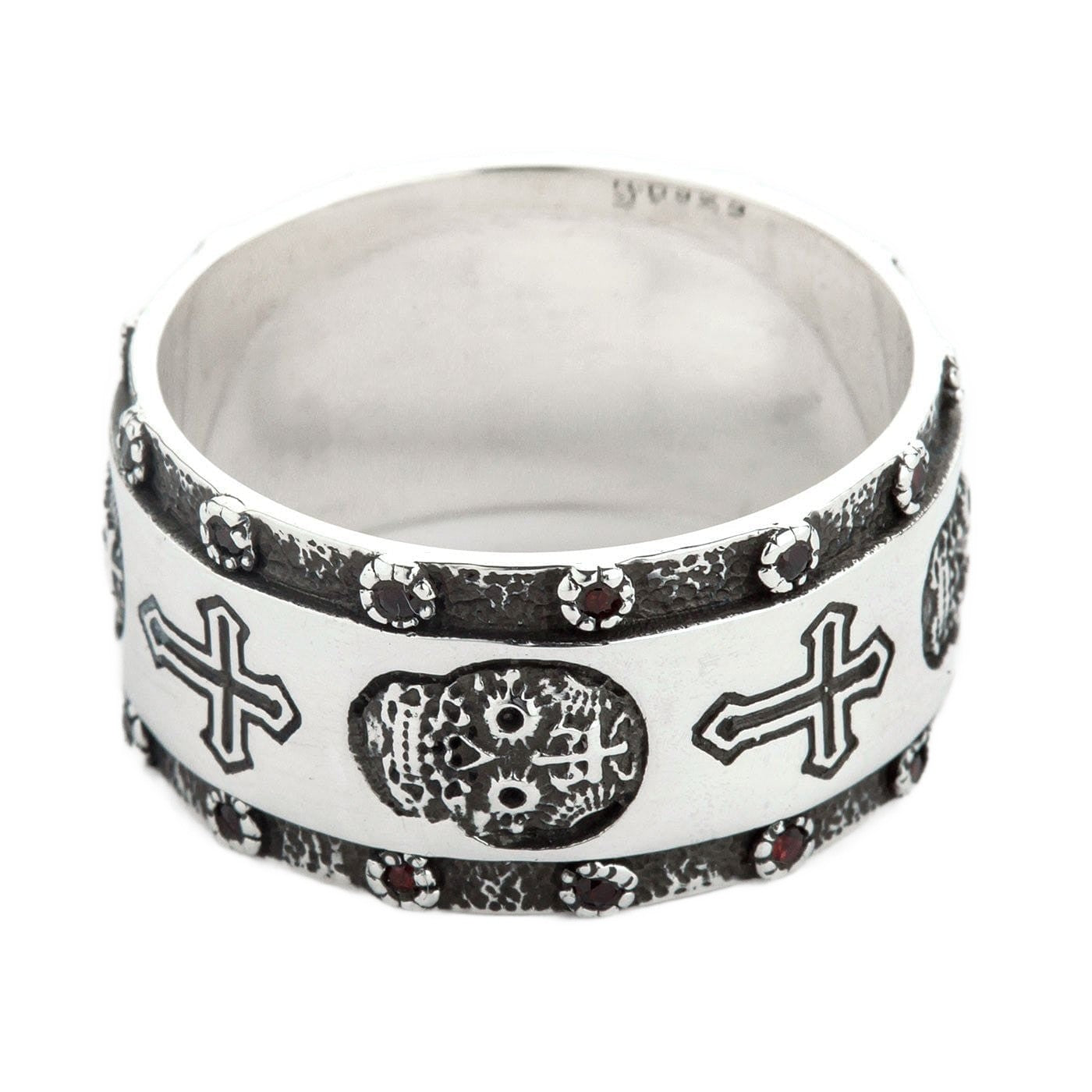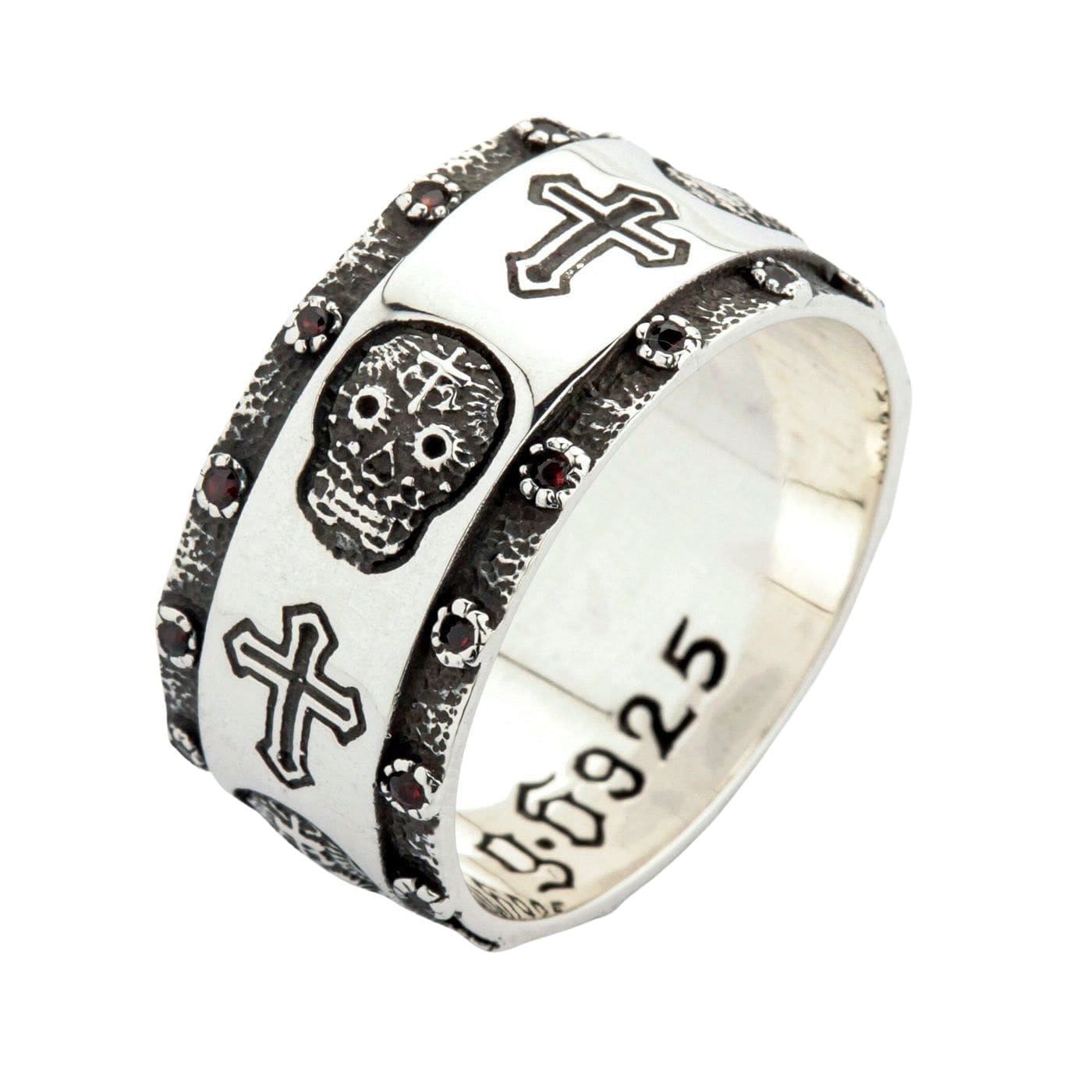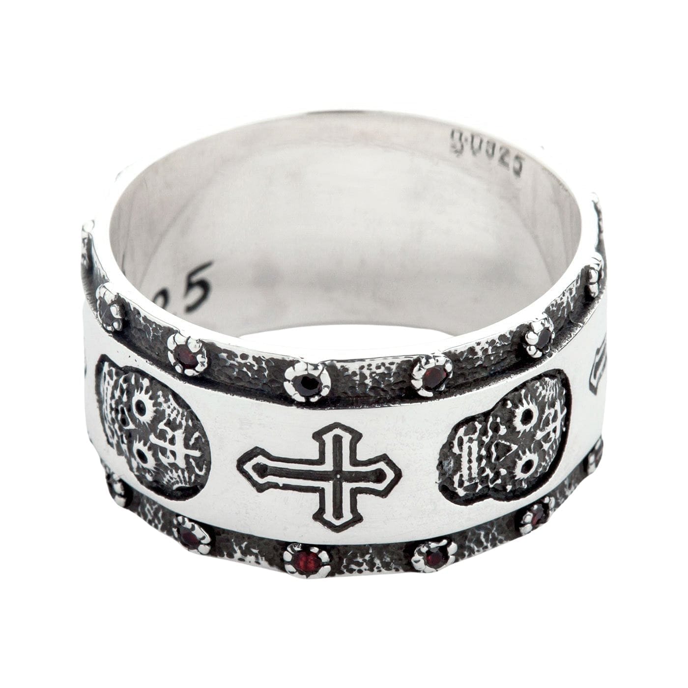 サンタ・ムエルテリング – ガーネット付きスターリングシルバー製聖死神リング