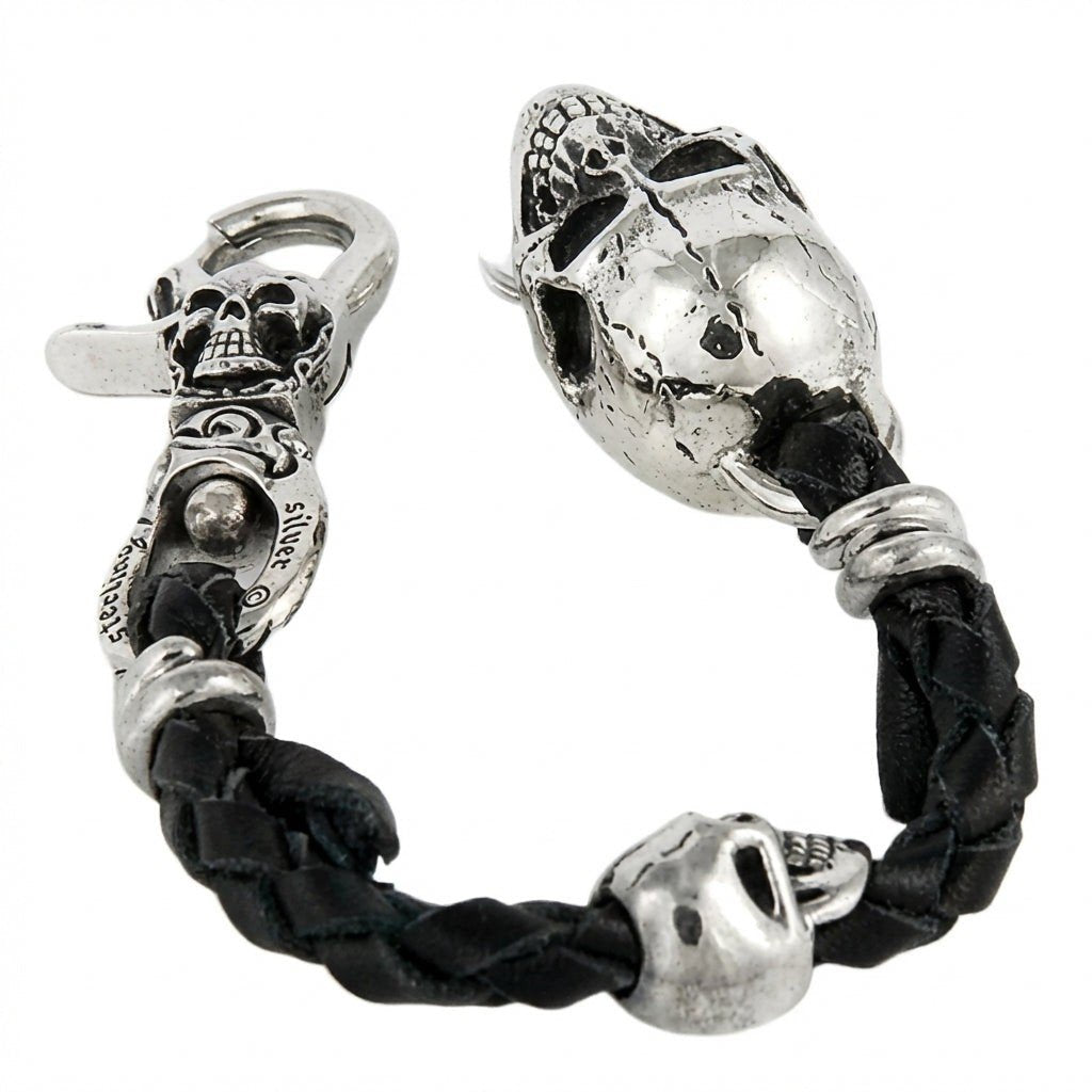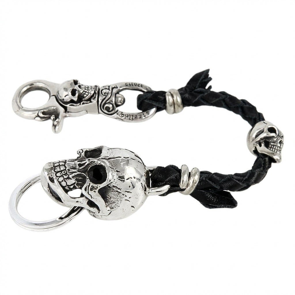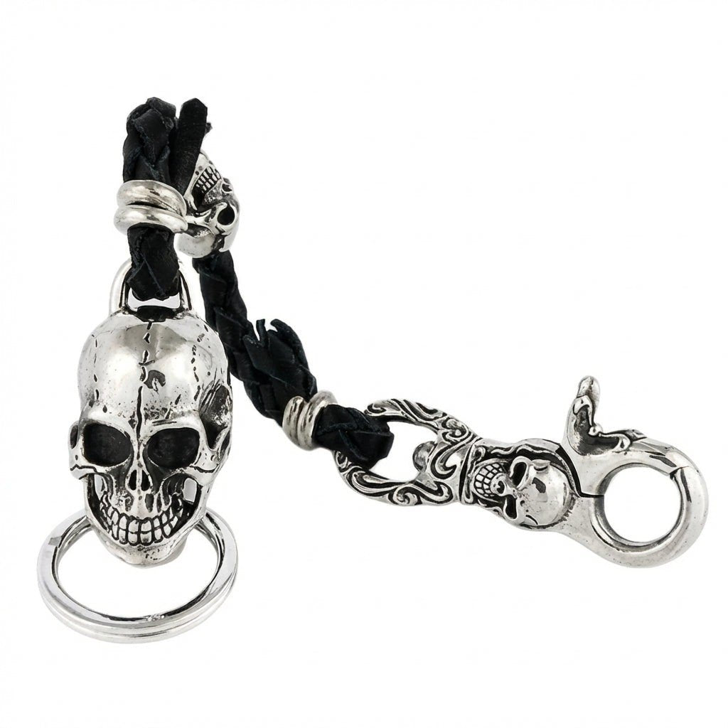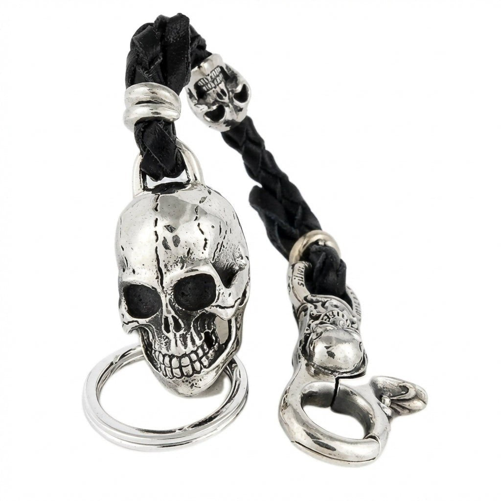 スターリングシルバー スカル レザー編み込み バイカー キーホルダー ウォレットホルダー