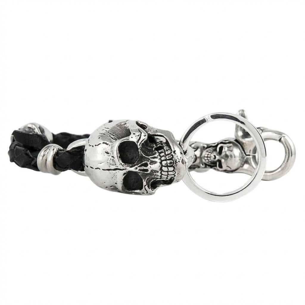 ウォレットチェーンにマッチするフォブ(飾り)をお探しの方へ — 編み込みレザーのセクションが、フルメタルのキーチェーンとウォレットチェーンの架け橋となります。先端のロブスタークラスプは、財布のグロメットやベルトループに簡単に装着可能。両端のスカルが、お手持ちのスカルモチーフのウォレットチェーンと統一感のあるスタイルを演出します。
