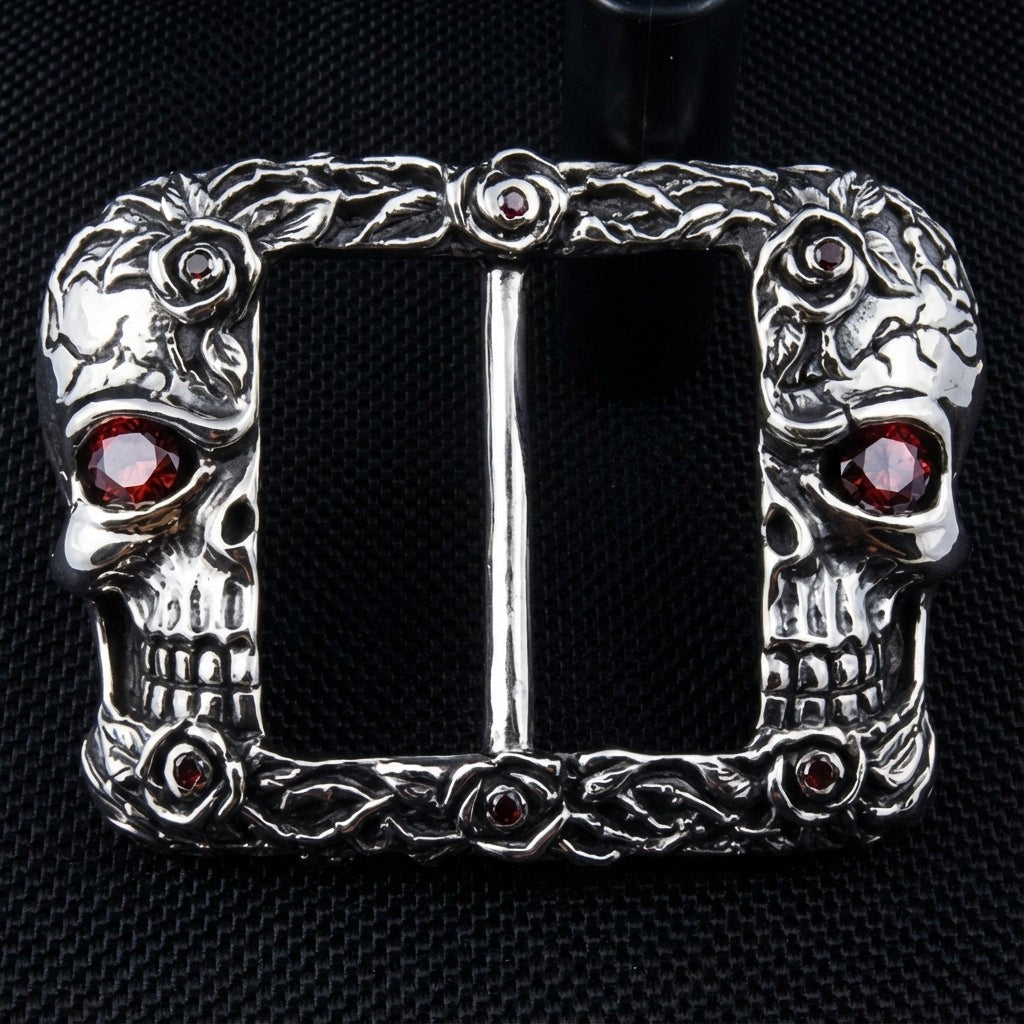 個性際立つスカル&ローズのベルトバックルで、バイカースタイルを表現。無垢の925スターリングシルバーを熟練職人が手作業で仕上げ、赤いガーネットの目が印象的なスカルと、バラやツタで優雅に縁取られた繊細なデザインです。
