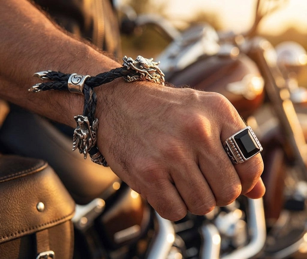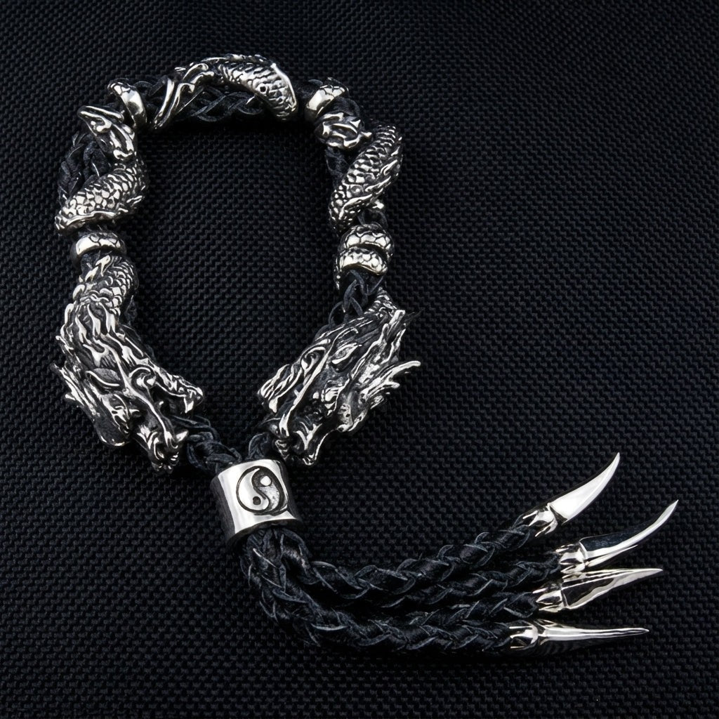ブレスレットは高品質な編み込み本革を使用し、スターリングシルバーのドラゴンと絶妙に調和。ワイルドさと上品さを兼ね備えた逸品です。