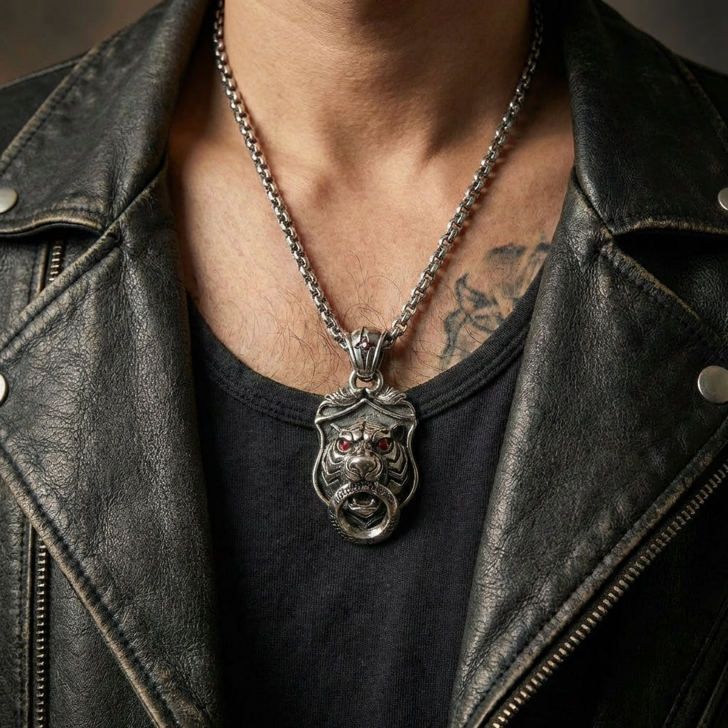 タイガーノッカーペンダント – レッドアイ付きスターリングシルバー バイカーネックレス