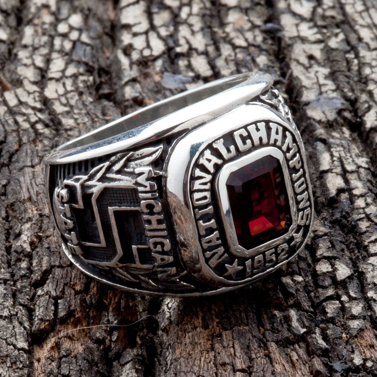 1952 미시간 주립대 "전국 챔피언" 반지로 역사적인 승리를 기념하세요. 이 반지는 단순한 주얼리가 아니라, 대학 스포츠의 역사 한 조각입니다. 925 스털링 실버로 정성스럽게 수작업 제작되었으며, 빈티지 스타일로 NCAA 풋볼 역사상 가장 위대한 팀 중 하나를 기리는 대담한 헌정작입니다.
