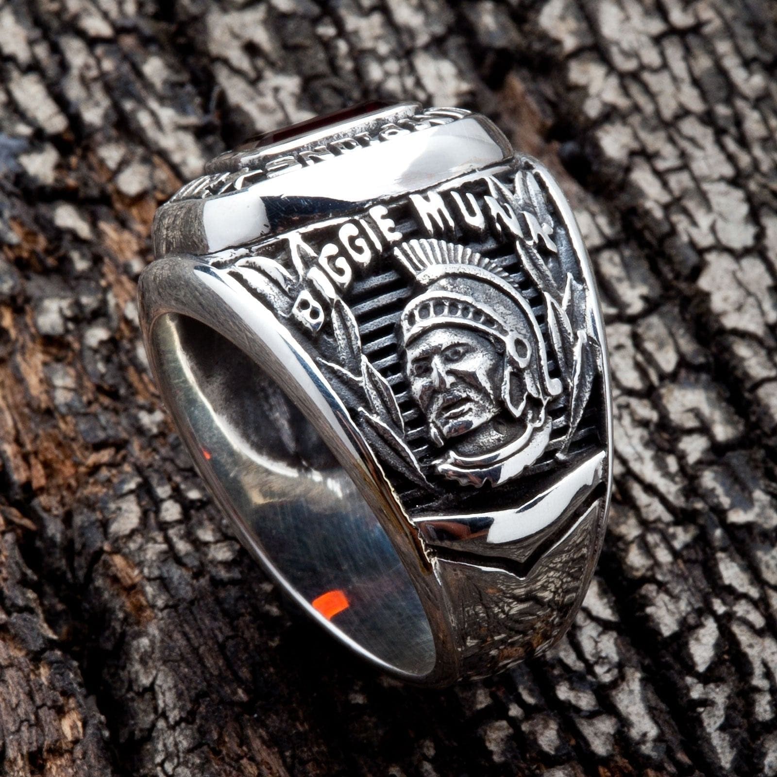 이 대학 챔피언십 반지는 1952년 클래식의 충실하고 정교한 재현입니다. 상단에는 대형 에메랄드 컷 레드 큐빅 지르코니아 스톤이 자리잡고 있으며, 그 주위를 "NATIONAL CHAMPIONS 1952"라는 문구가 둘러싸고 있습니다. 한쪽 면에는 "MICHIGAN STATE"와 상징적인 "S" 로고가 자랑스럽게 새겨져 있고, 반대편에는 전설적인 코치 "Biggie" 먼과 강렬한 스파르탄 마스코트가 함께 새겨져 있습니다. 깊이 있는 산화 처리된 디테일이 이 풋볼 반지의 모든 요소를 더욱 돋보이게 합니다.
