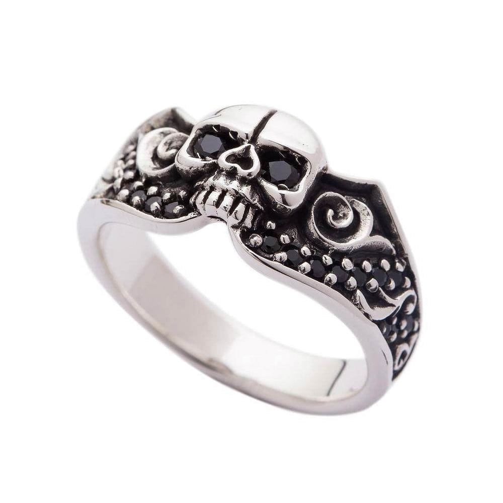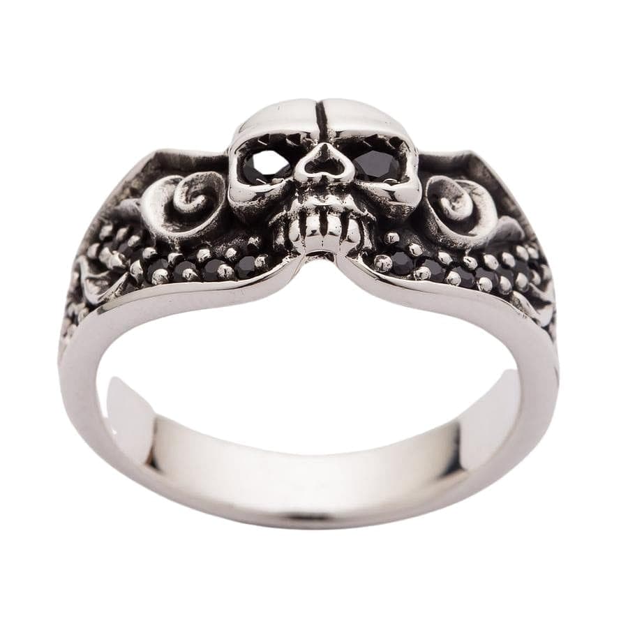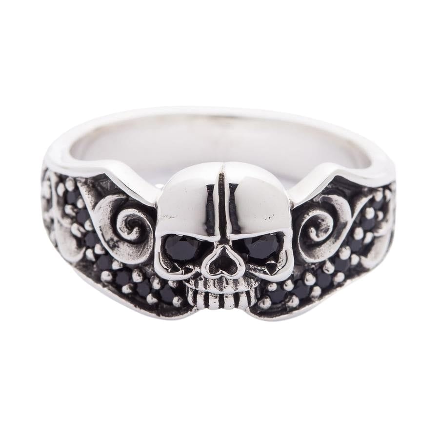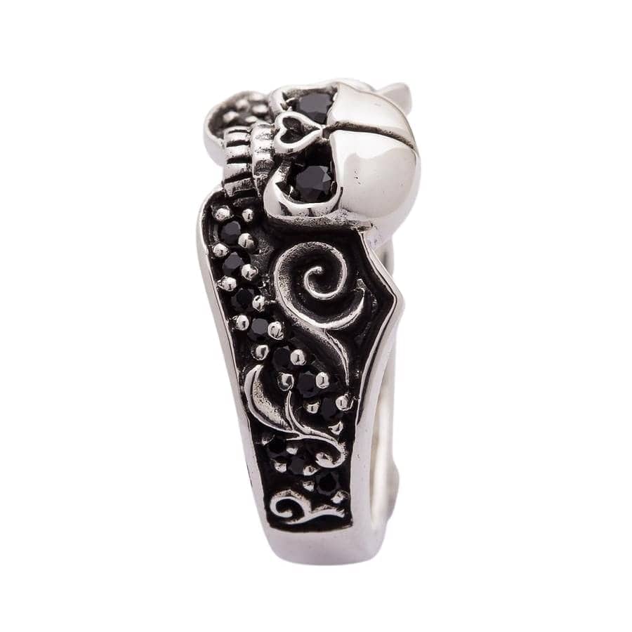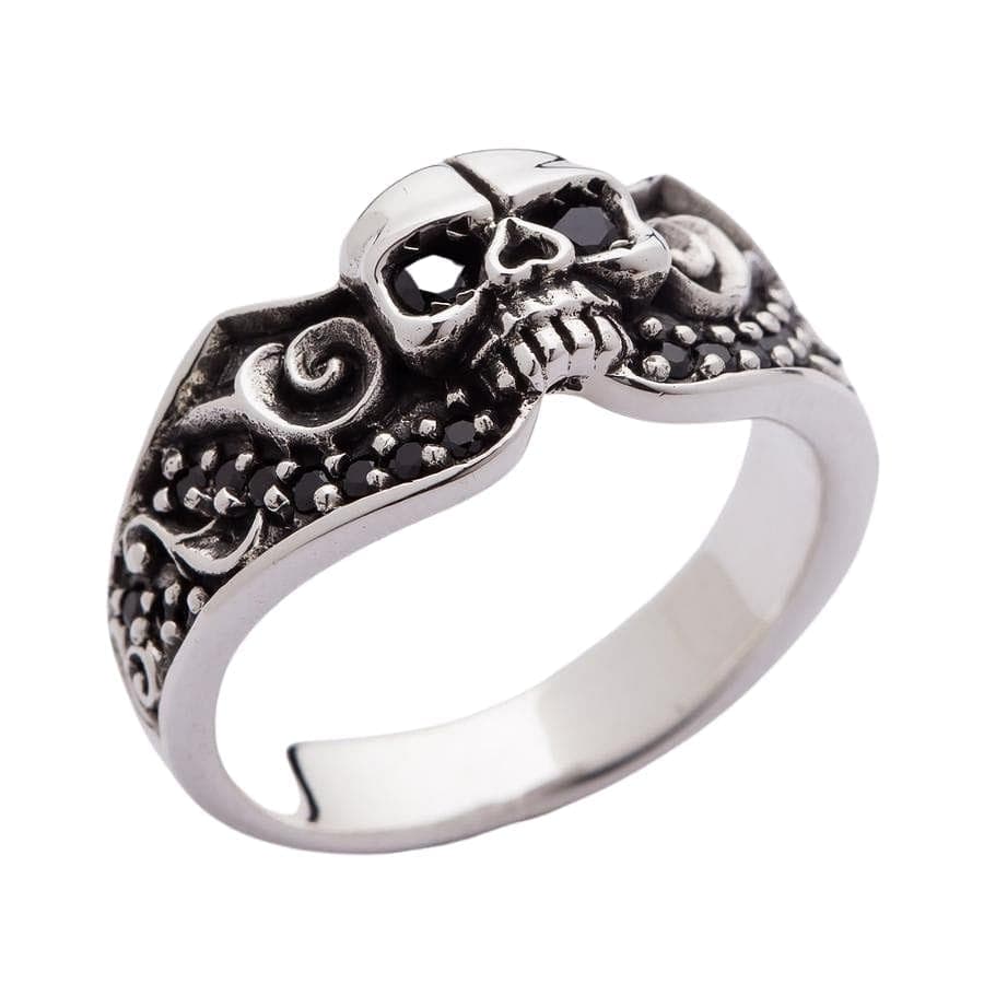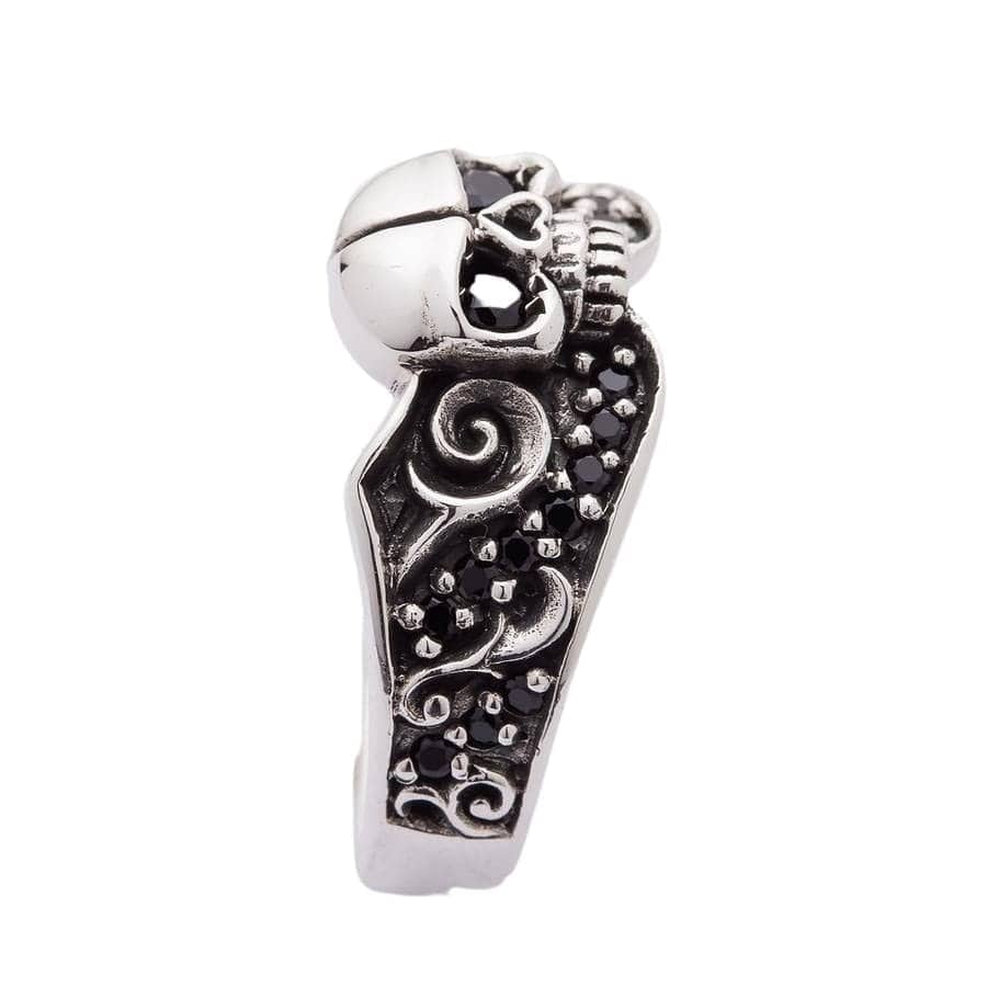 이 반지는 고딕 로맨스의 정수를 담고 있습니다. 깊은 검은색 스톤 눈을 가진 묵직하고 광택 있는 해골이 중앙에 자리 잡아, 죽음조차 뛰어넘는 충성과 영원한 유대감을 상징합니다. 밴드는 해골에서부터 정교한 트라이벌 고딕 소용돌이로 우아하게 이어지며, 일부는 반짝이는 검은 스톤으로 장식되어 있습니다.