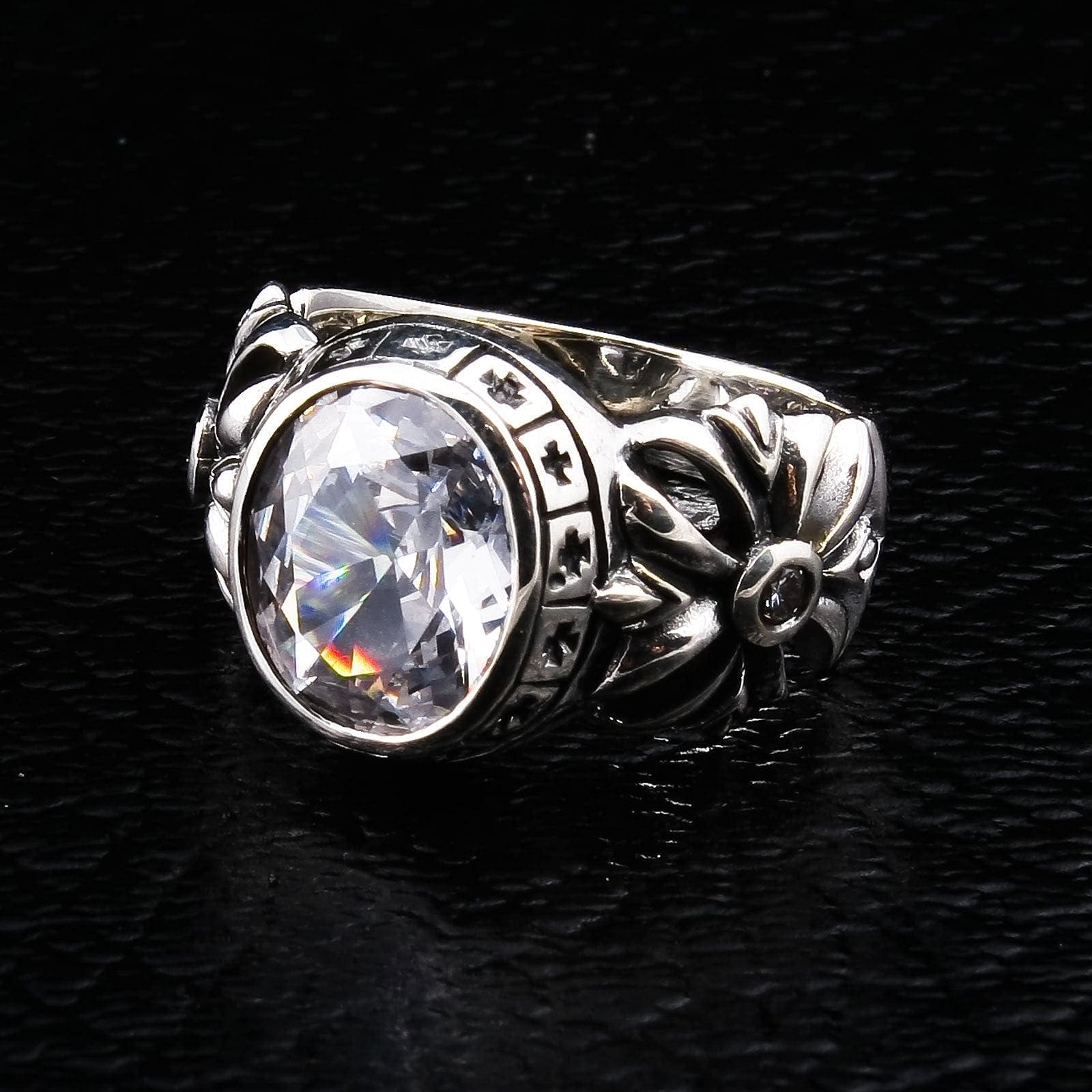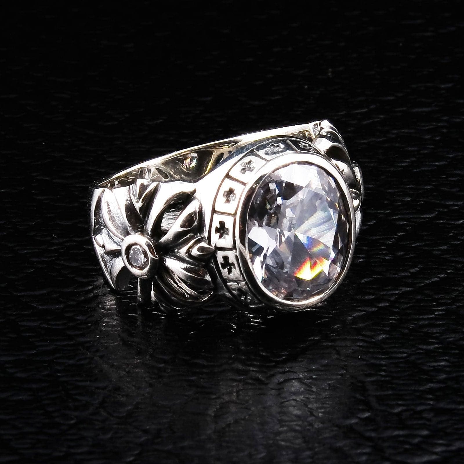 이 반지의 중심에는 거대한 타원컷 화이트 토파즈(CZ)가 자리하고 있습니다. 다이아몬드처럼 맑고 투명한 이 보석은 명료함, 강인함, 목적의 상징으로 알려져 있습니다. 빛을 받으면 찬란하게 빛나며 시선을 사로잡는 포인트가 됩니다. 반지 전체는 순수 .925 스털링 실버로 정교하게 수작업 제작되었고, 산화 처리로 각 조각의 깊이가 더욱 돋보입니다. 더 다양한 신성한 디자인은 크리스천 반지 컬렉션에서 만나보세요.