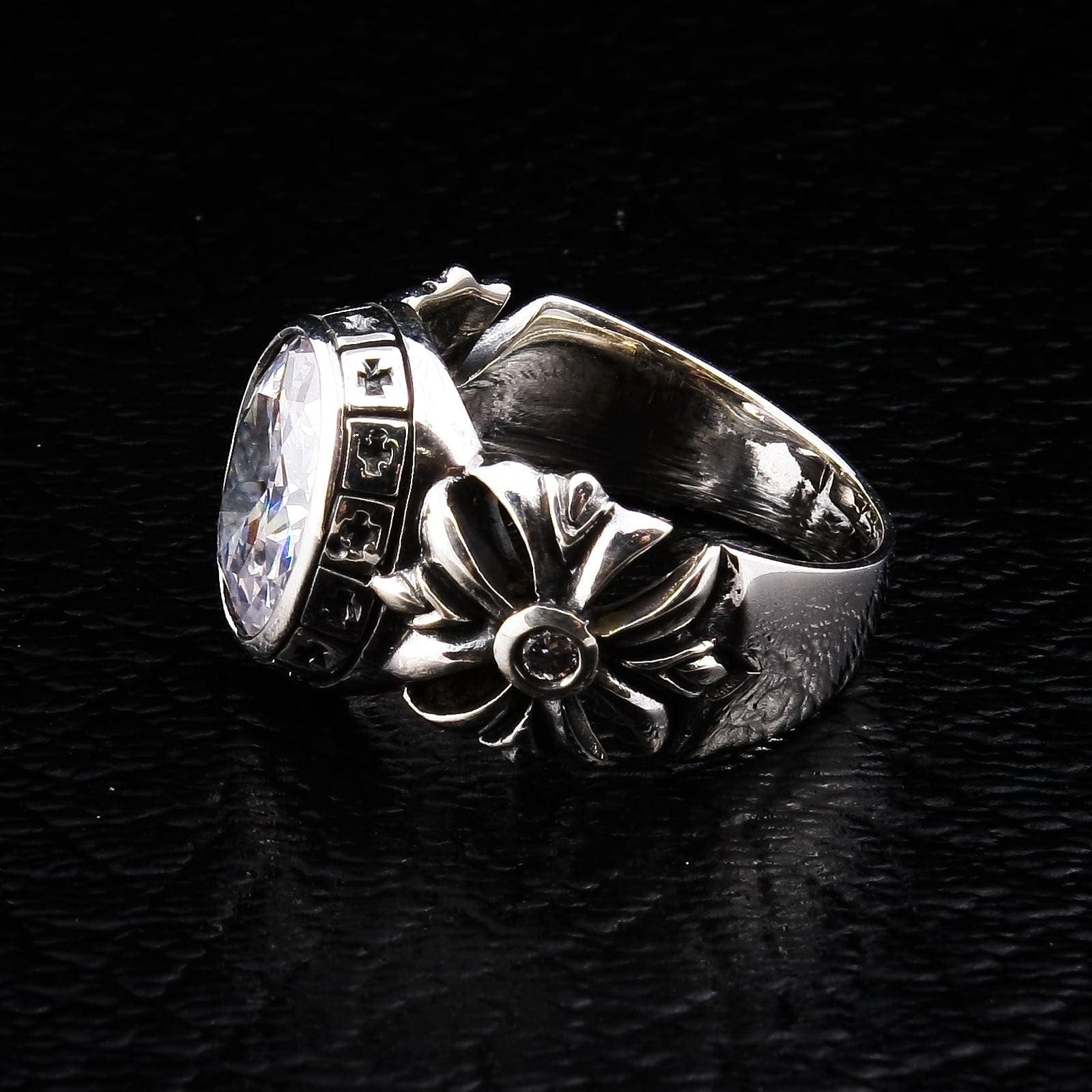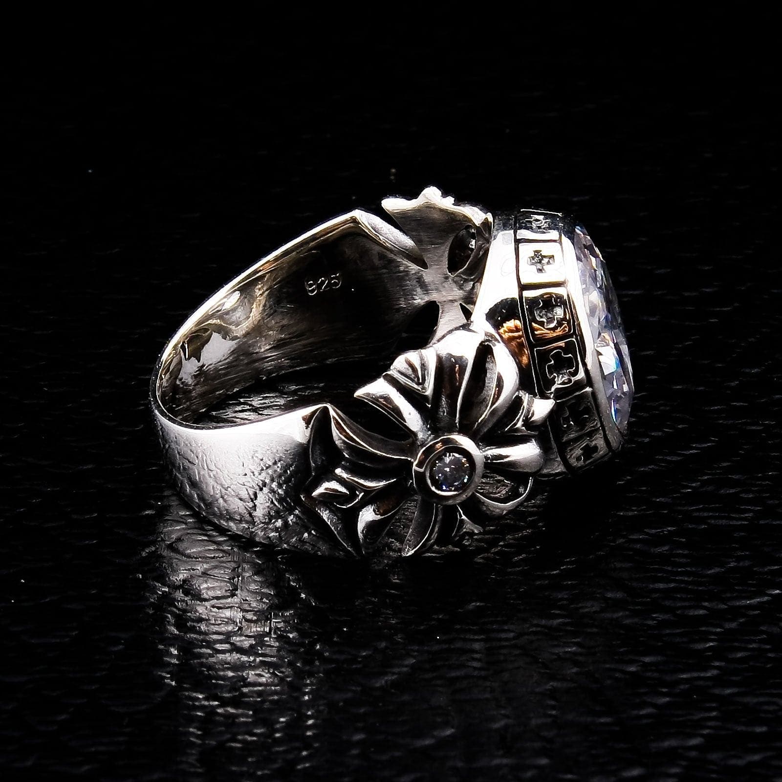 이 반지는 영적, 건축적 상징이 풍부하게 담겨 있습니다. 반지의 측면에는 유럽 대성당의 화려한 고딕 트레이서리를 연상시키는 강렬한 플로럴 십자가가 새겨져 있습니다. 중앙 스톤을 감싸는 베젤에는 작은 십자가 패턴이 반복되어, 마치 성당의 스테인드글라스 창을 떠올리게 합니다. 헌신과 역사를 담은 복합적이고 조화로운 디자인입니다.