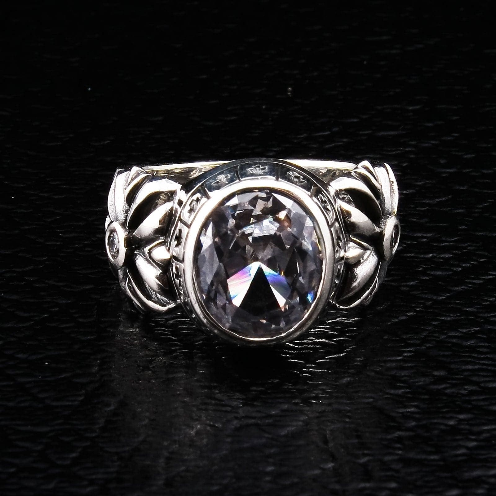 💎 찬란한 화이트 토파즈: 거대한 타원형 컷의 다이아몬드처럼 맑은 화이트 토파즈 CZ 스톤이 세팅되어, 맑은 정신과 힘을 상징합니다.