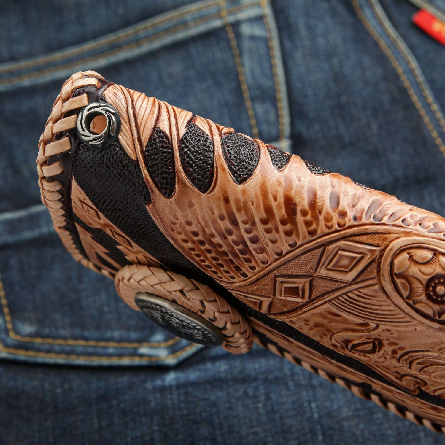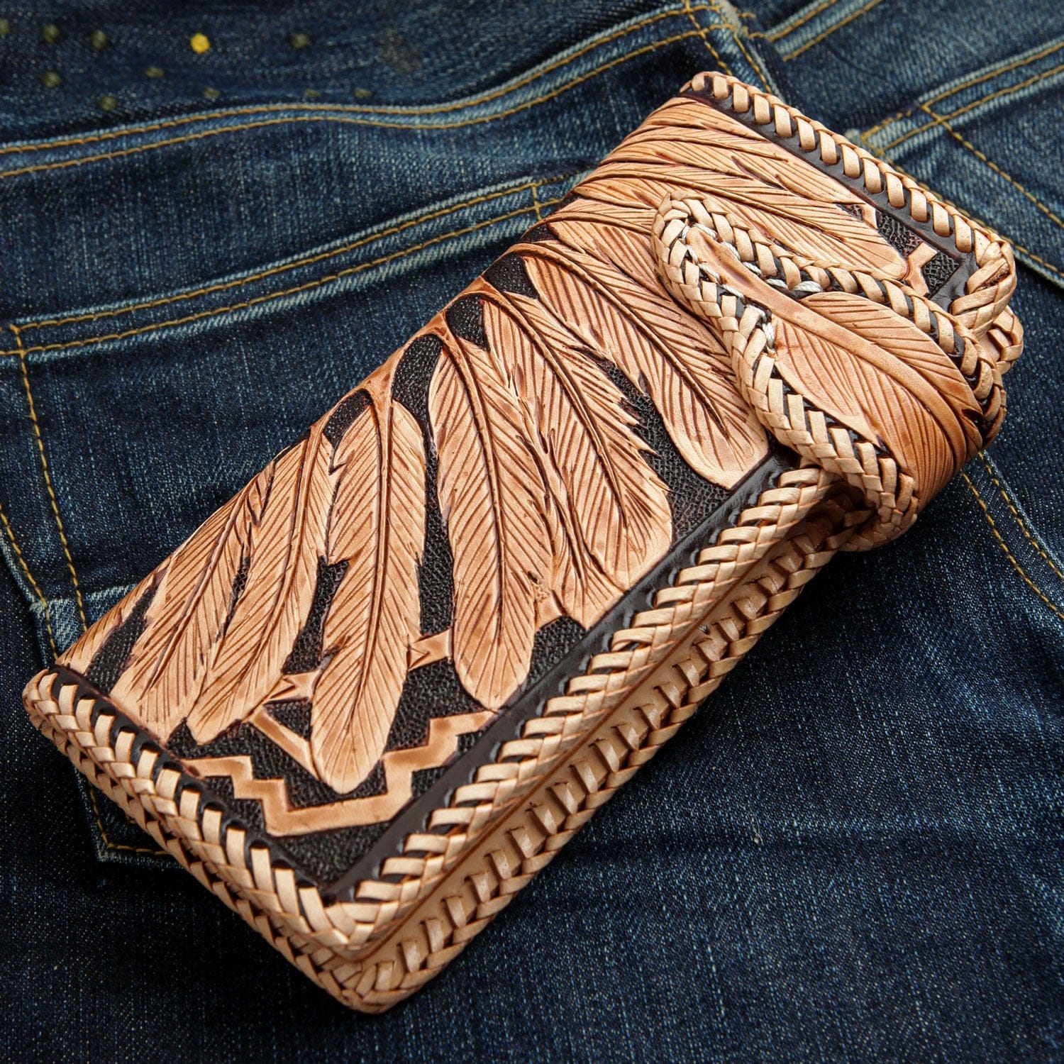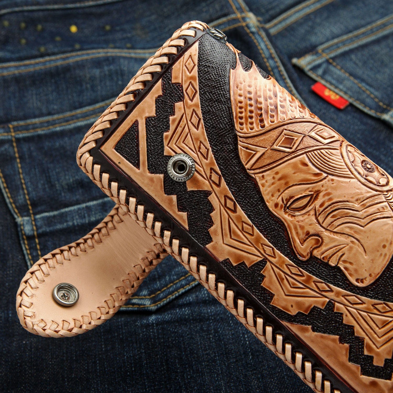 수제 조각 아메리칸 인디언 추장 가죽 바이커 지갑